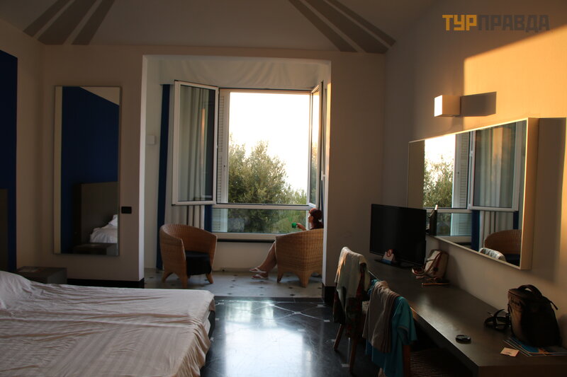 Mū sų vieš butis vadinosi Punta San Martino 4*. Mums taip pat nepaprastai pasisekė su vieš buč iu, jis buvo į sikū rę s ant kalno, su panoraminiu vaizdu į Ligū rijos jū rą , su dviem baseinais ant stogo ir praš matniu restoranu su vaizdu į Genujos į lanką . Dvivietis kambarys taip pat buvo praš matnus, su dideliu plotu,