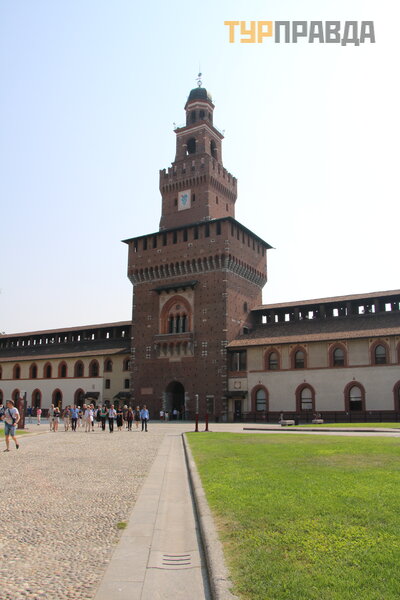 Sforcų pilis yra Visconti š eimos lizdas, pastatytas XIV amž iuje, tač iau vė liau buvo sunaikintas. O jau XV amž iuje Sforcų pastangomis apgriuvusi pilis gavo naują gyvenimą . Pilies matmenys į spū dingi, o tvirtovė s sienose į akis krenta neį tikė tinas spragų skaič ius, o tai rodo nuolatinę pilies apgultį . Dabar pastatas priklauso savivaldybei ir naudojamas ne tik kaip muziejus. Merė č ia į rengė miesto prieglaudą katė ms, visos benamė s katė s turi galimybę gyventi tokiame „penkių ž vaigž duč ių vieš butyje“ su daugybe rū sių su pelė mis.