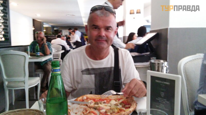 Kadangi buvo pietų metas, kavinė buvo sausakimš a italų , o kadangi jie labai garsiai š neka, ausyse buvo ne tik triukš mas, o plepalai. Sunkiai laukdami padavė jo, jie už sisakė capriccioso picą ir paccheri makaronus. Iš viso už sakymo kapuč ino buvo tikrai skanus. Pica buvo didž iulis blynas ir minimalus priedų kiekis (o mes į pratę prie už pilų taip, kaip turi bū ti), o makaronai buvo nepakankamai iš virti didž iuliai makaronai su kaž kokia nesuprantama medž iaga. Są skaita dviems – 30 eurų , malonumas – nulis.