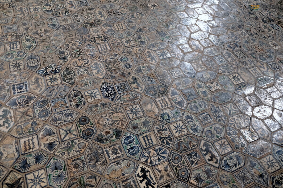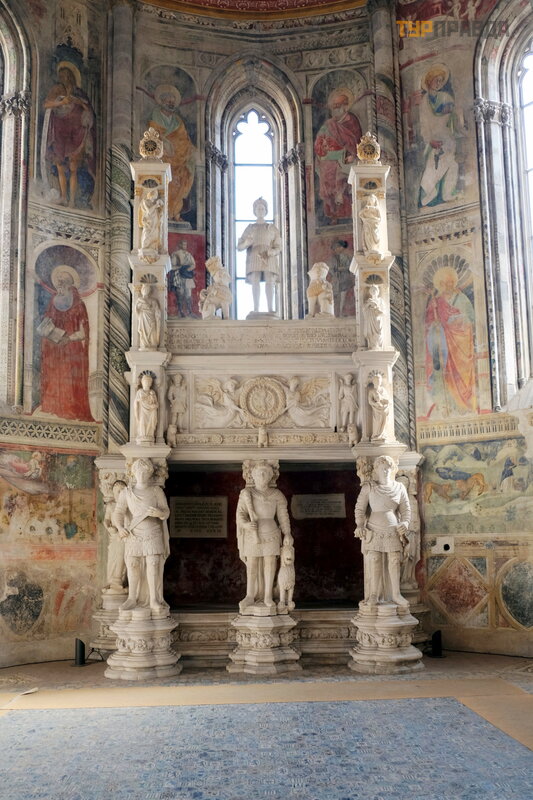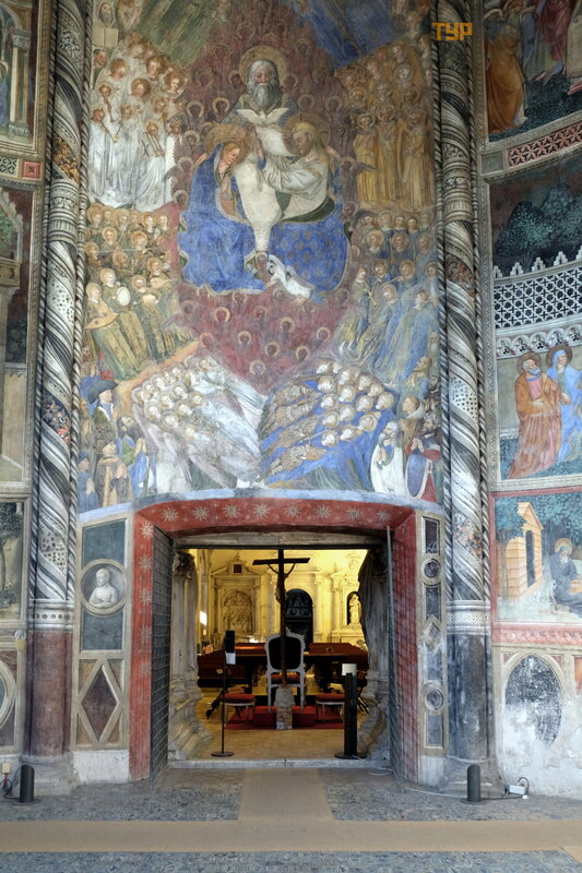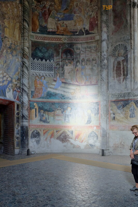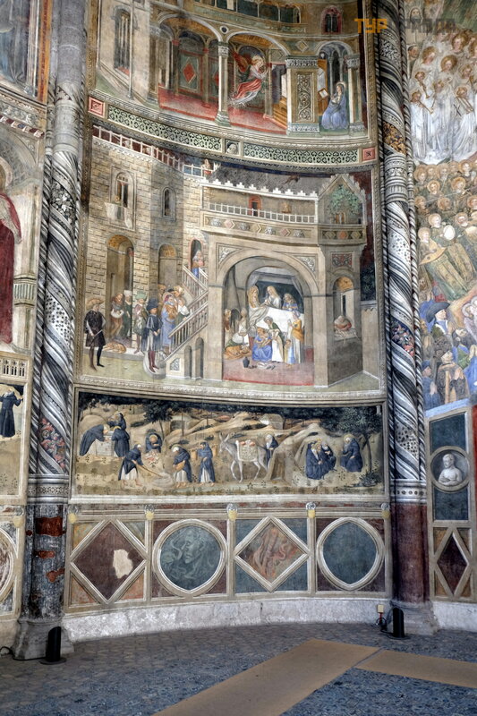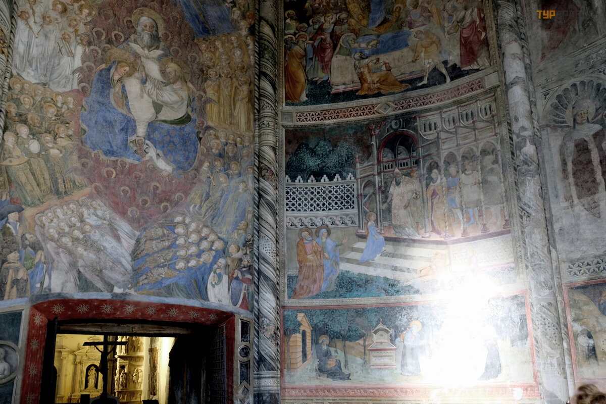 nuotrauka. Koplyč ioje yra graž ios maolikos grindys ir freskos Mergelė s ir Paskutiniojo teismo tema.