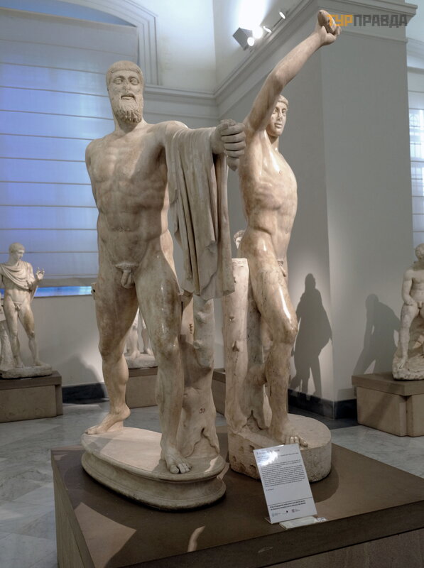 Arba „Tirono ž udikai“ Aristogeitonas ir Harmodijus (tapo „darbininkė s ir kolū kio moters“ prototipu) II a. e. graikiš ko originalo kopija, V a. pr. Kr e.