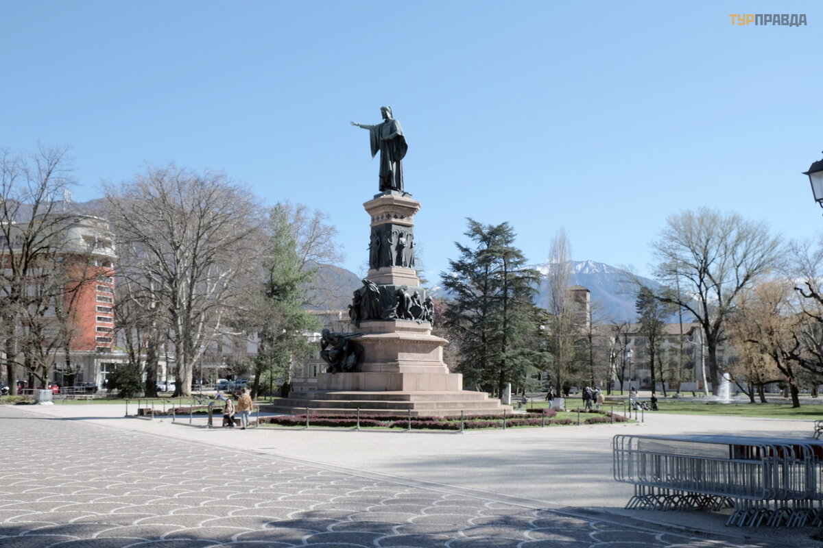 Atvykome į Trentą apie 14.00 val. , stotyje yra informacijos punktas, kuriame galite gauti miesto ž emė lapį . Temperatū ra buvo apie 20 laipsnių . Prieš ais stotį Dantė s aikš tė su graž ia aikš te ir paminklu poetui.