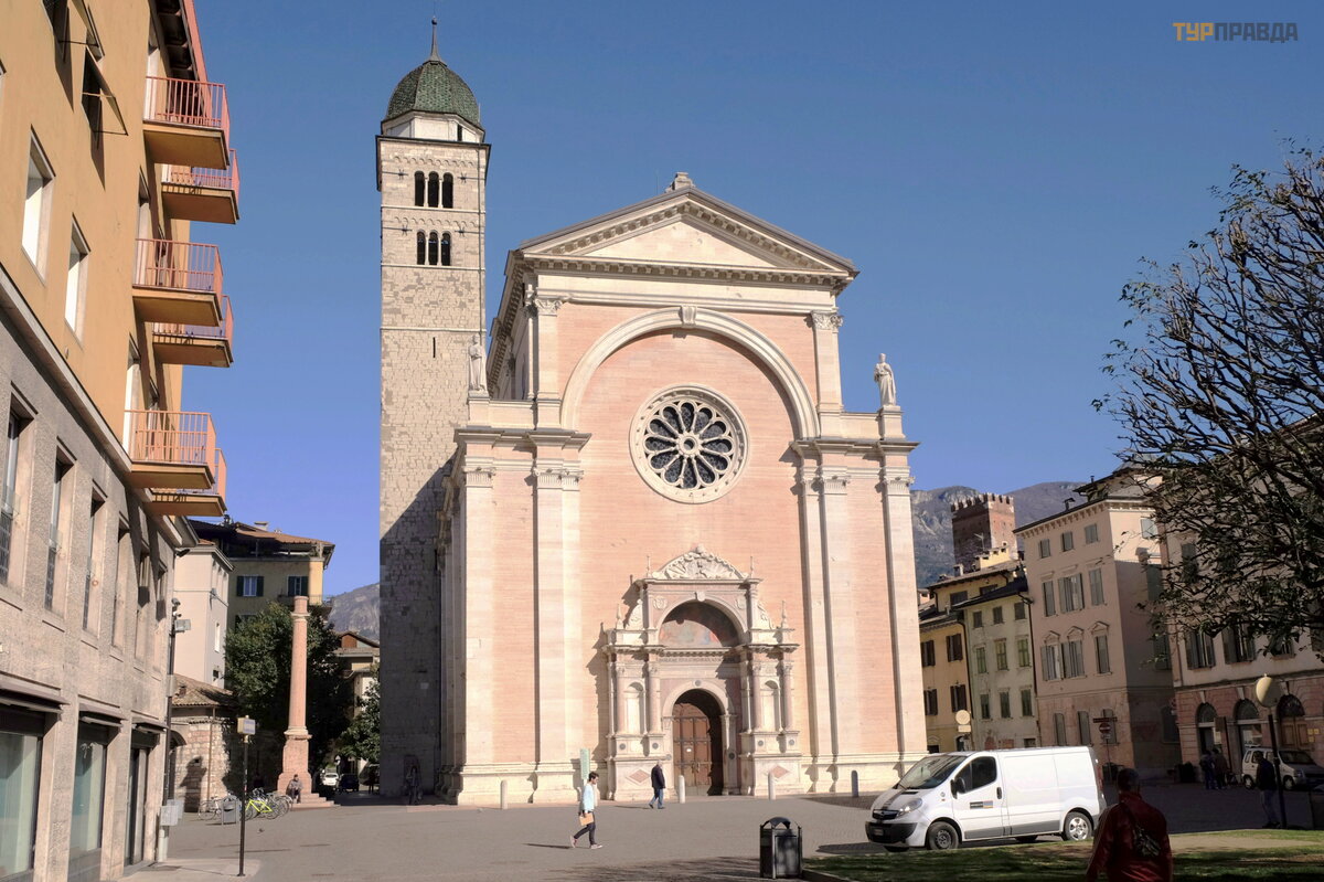 Š alia baž nyč ios esanti varpinė yra aukš č iausias Trento pastatas; jo aukš tis yra 53 metrai; Jis buvo pastatytas iš balto kalkakmenio. Keista, kad tokia baž nyč ia buvo pastatyta vos per 5 metus.