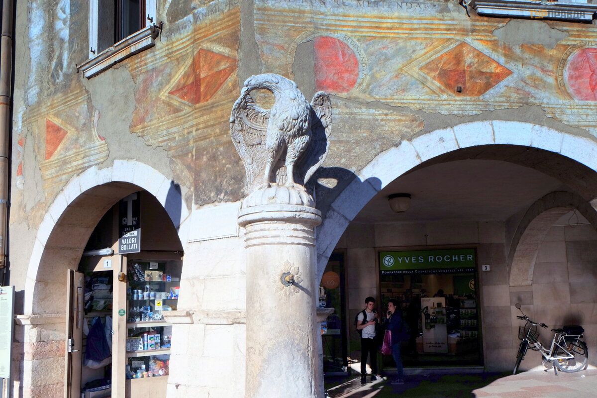 Š alia vieno iš nudaž ytų namų nepastebimai stovi Erelio fontanas (erelis yra oficialus Trento simbolis):
