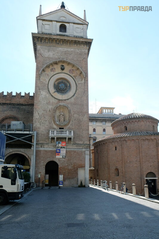 К ротонде примыкает Палаццо делла Раджоне с башней и астрологическими часами. Часовая башня построена в 1473 году по проекту Луки Фанчелли, а в 1493 году на ней были установлены изумительные часы Бартоломео Манфреди – механика, математика и астролога при дворе Гонзага. Часы претерпели несколько этапов реставрационных работ и до сих пор действуют. Они не только показывают время, но и месяц, фазы луны, а также указывают на положение планет и зодиакальных созвездий.