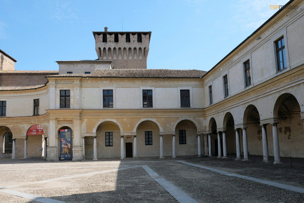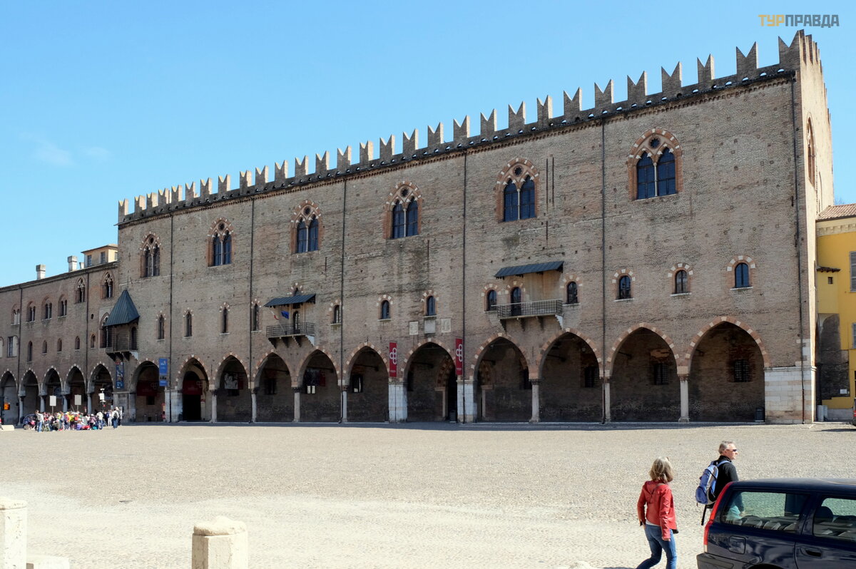 На противоположной стороне площади Палаццо Дукале, основанный в XIII веке. Это целый комплекс зданий разных эпох. Весь комплекс включает около 500 комнат, общая площадь 34 тыс. кв. м. Самое старое здание – именно то, фасад которого выходит на Пьяцца Сорделло. Оно называется Палаццо дель Капитано и напоминает о той поре, когда первые Гонзага носили звание « Капитано дель Пополо» – « Капитан Народа» .