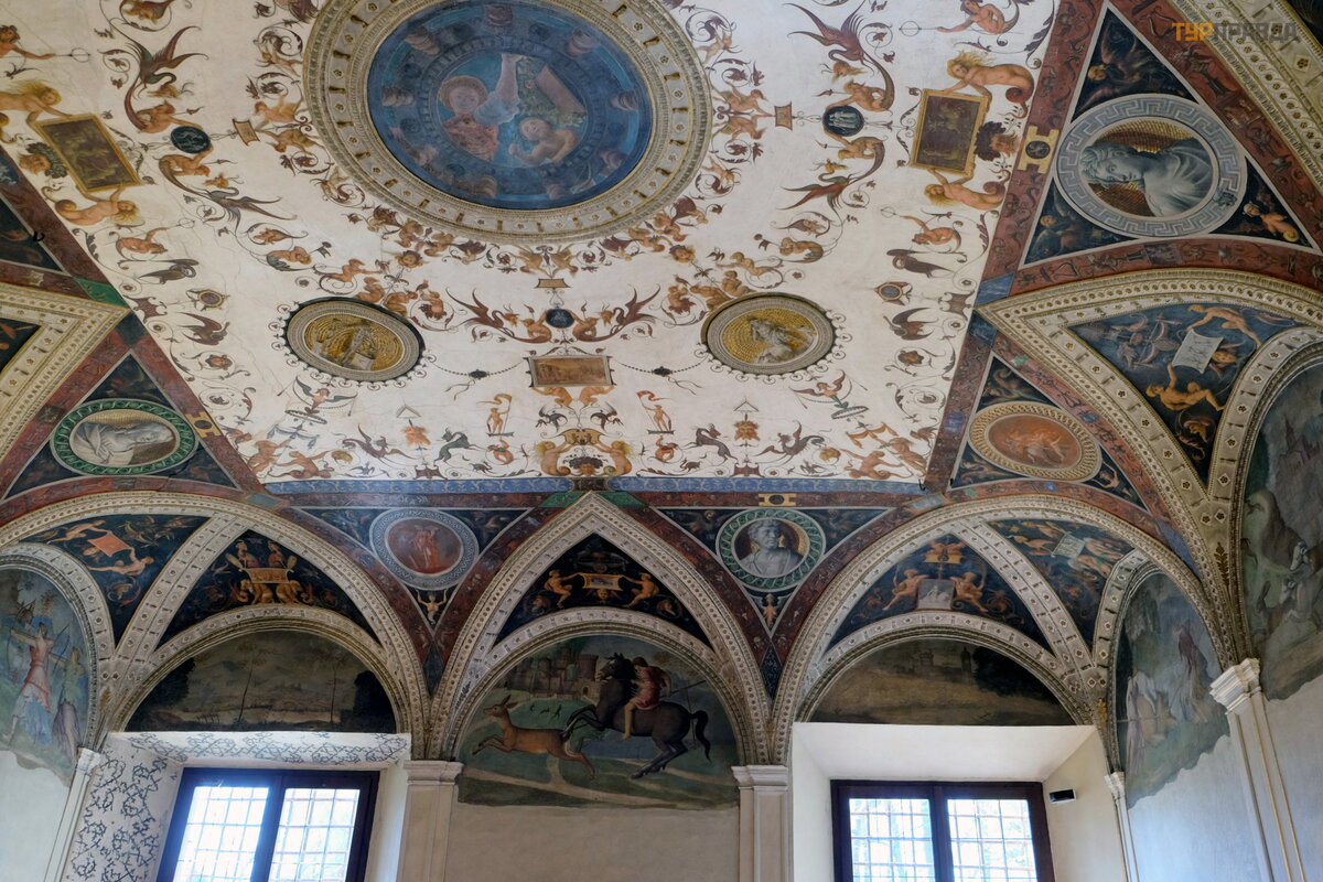 Самая знаменитая комната Палаццо Дукале – Камера дельи Спози (Комната новобрачных), расписанное фресками Андреа Мантеньив 1465-1474 гг. и знаменитое благодаря высокому качеству изображений, включающих около 30 портретных фигур, в основном семейства Гонзаго, а также умелому использованию перспективных обманок. Надо сказать, что в сезон осмотреть эту комнату затруднительно из-за большого скопления народу, да и время ограничивают, а тут повезло, никого кроме школьной экскурсии.