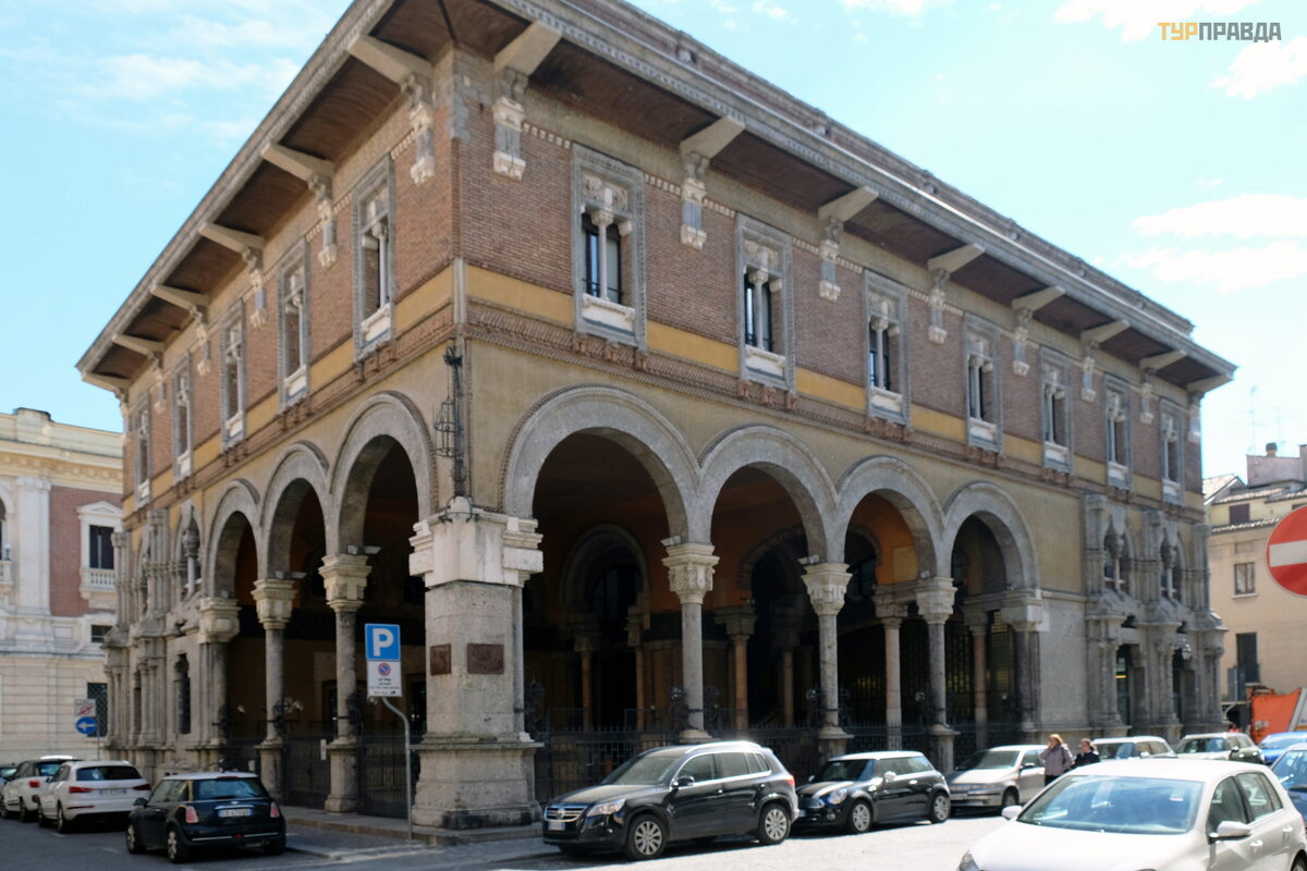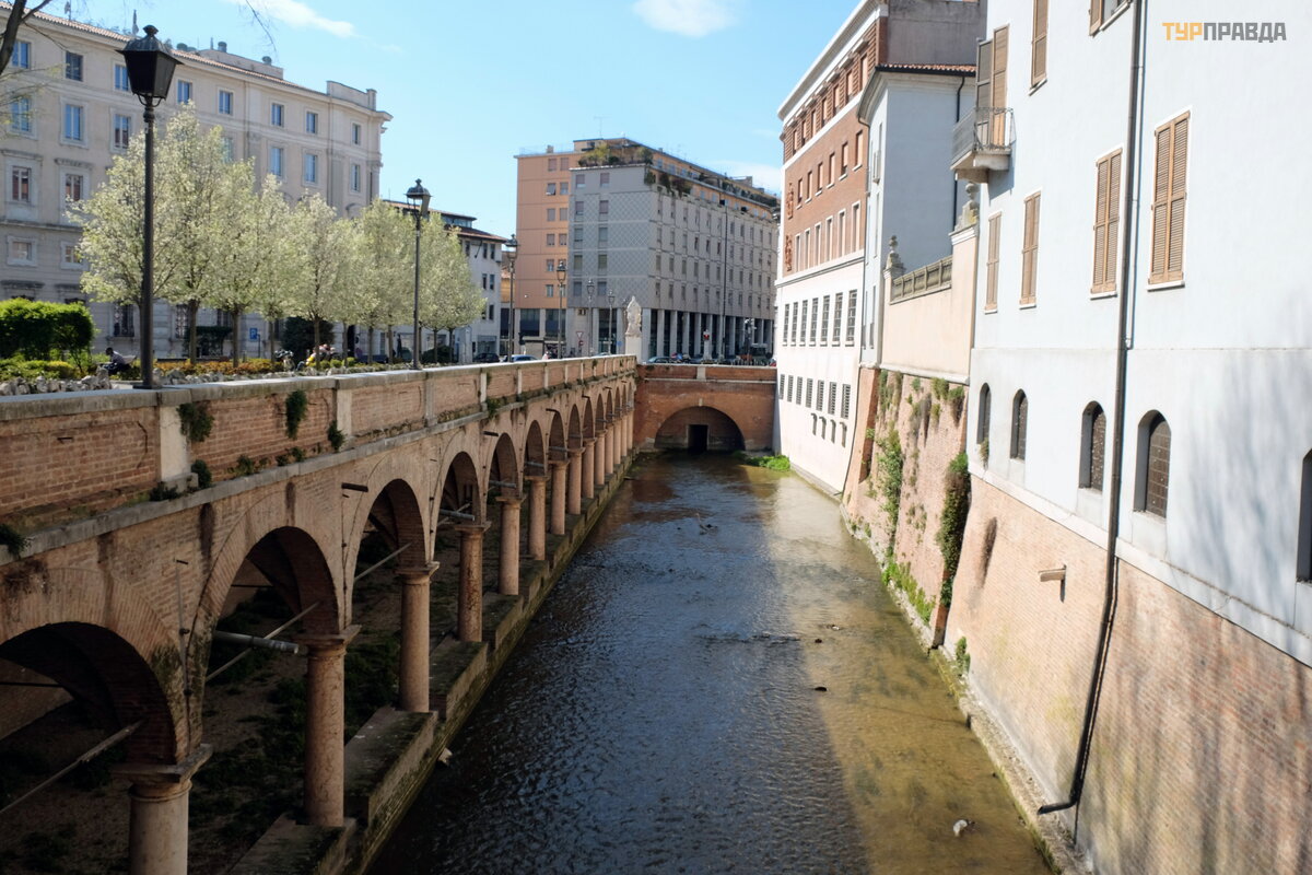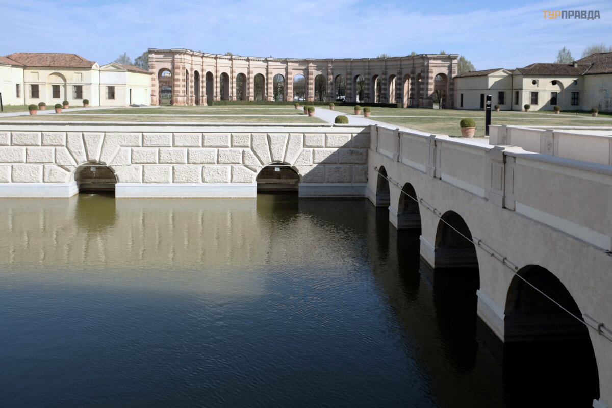 Внизу бывший канал, когда-то улицы Мантуи соединялись на манер Венеции. Арки и колонны, которые вы видите внизу – это бывший Рыбный рынок, построенный по проекту Джулио Романо в 1536 году: