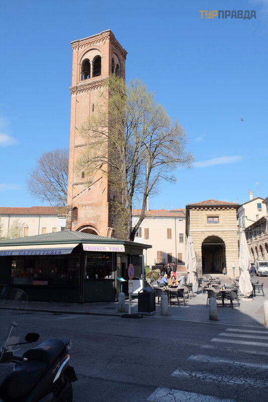 Левее его находится настоящее средневековое здание, да еще и с башней (в лесах). Это палаццо Подеста. Башня « Торре делла Габбья» (на итал. Torre della Gabbia) – это средневековая башня, расположенная на улице Via Cavour. Башня была построена в 1281 году семьей Асерби, хотя некоторые источники утверждают, что башня была построена в 1302 году архитектором Бонакольси.