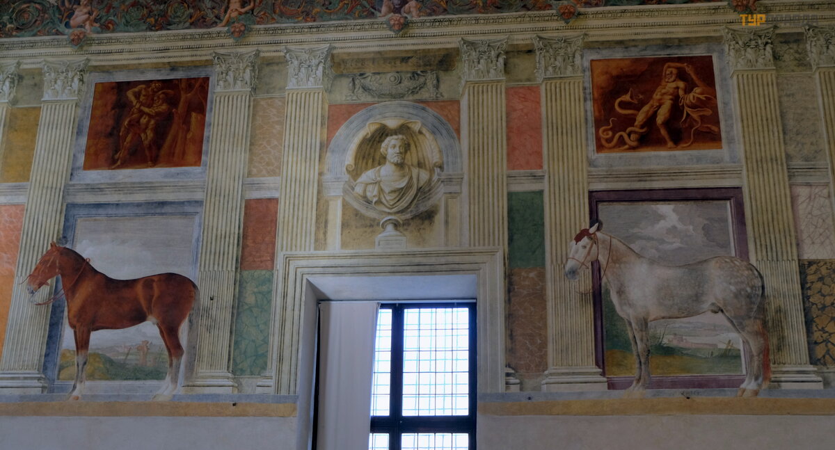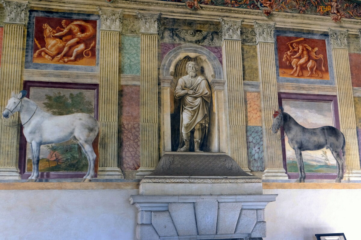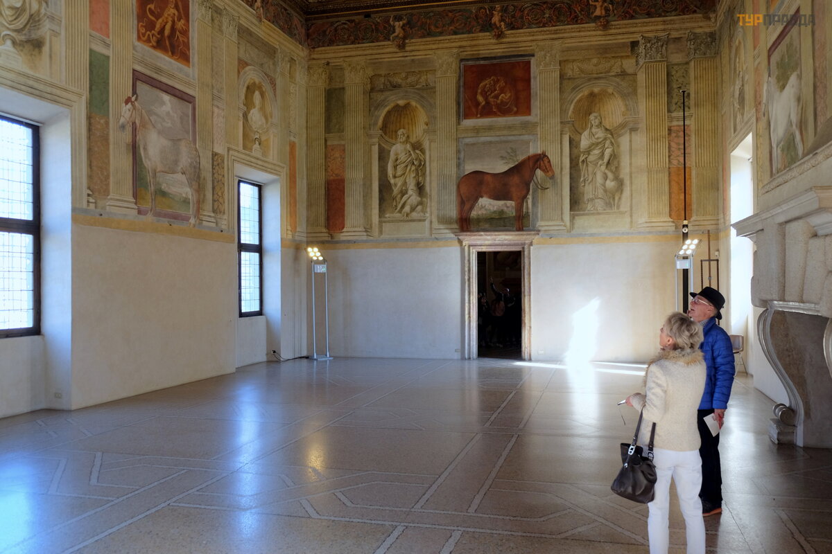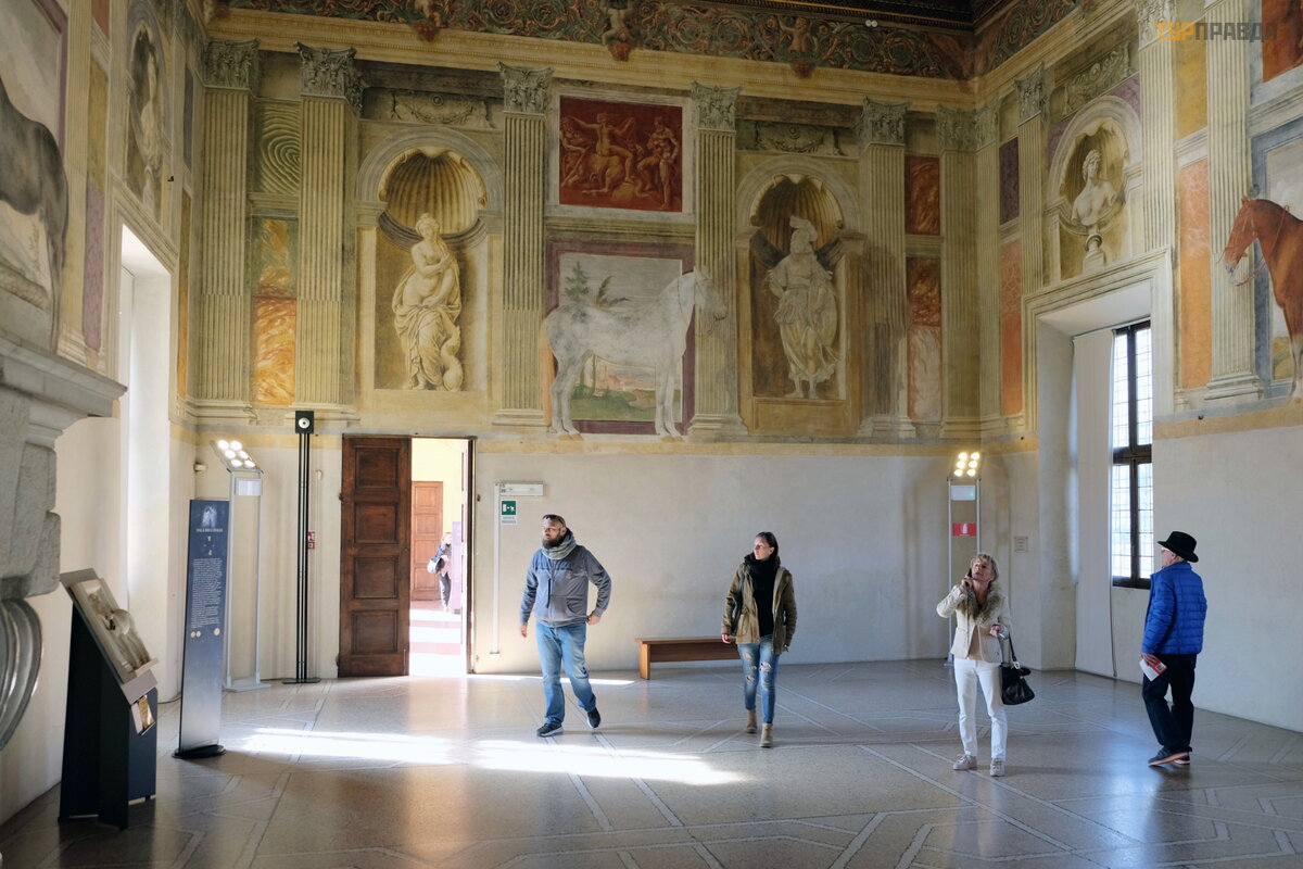 Первый яркий зал называется Salone dei Cavalli, то есть Салон лошадей. Федерико II, да и все Гонзага, видно, что Гонзага лошадок любили, хотя зрелище довально странное.