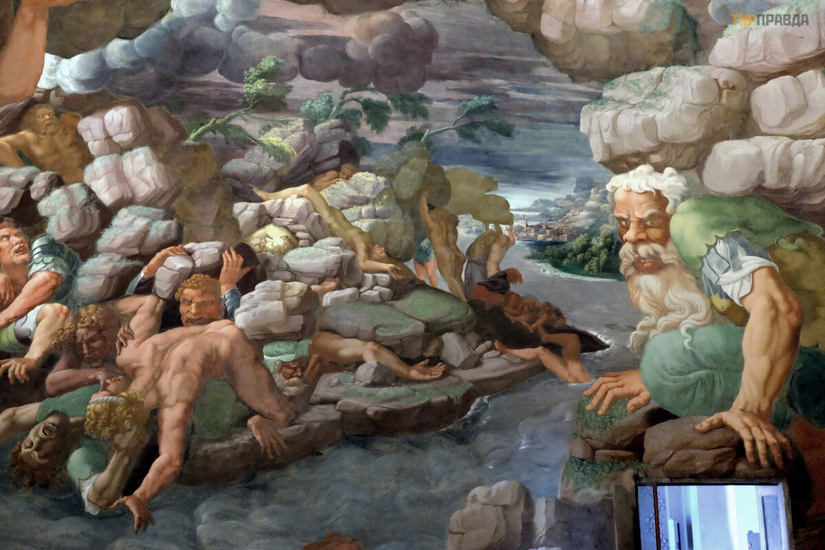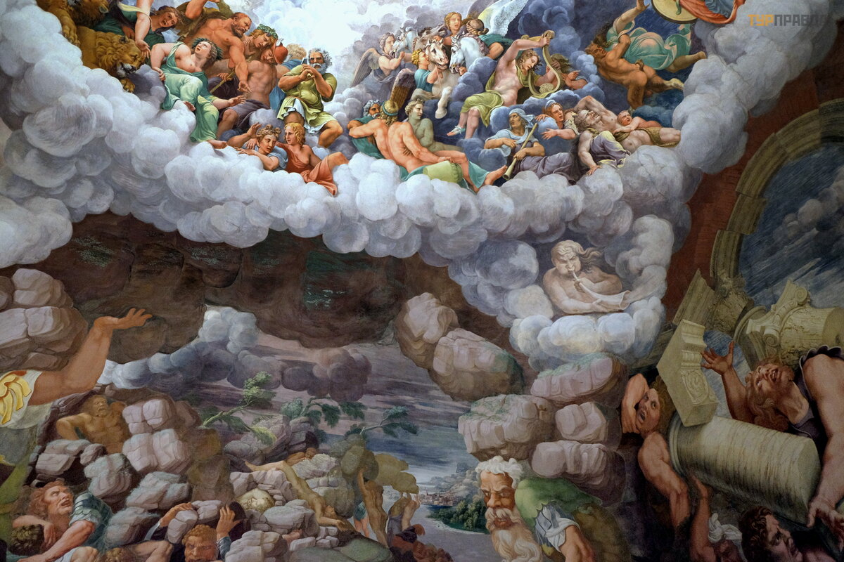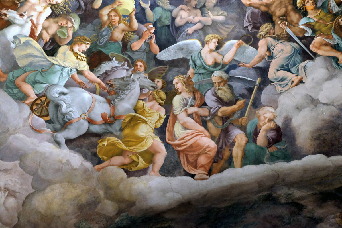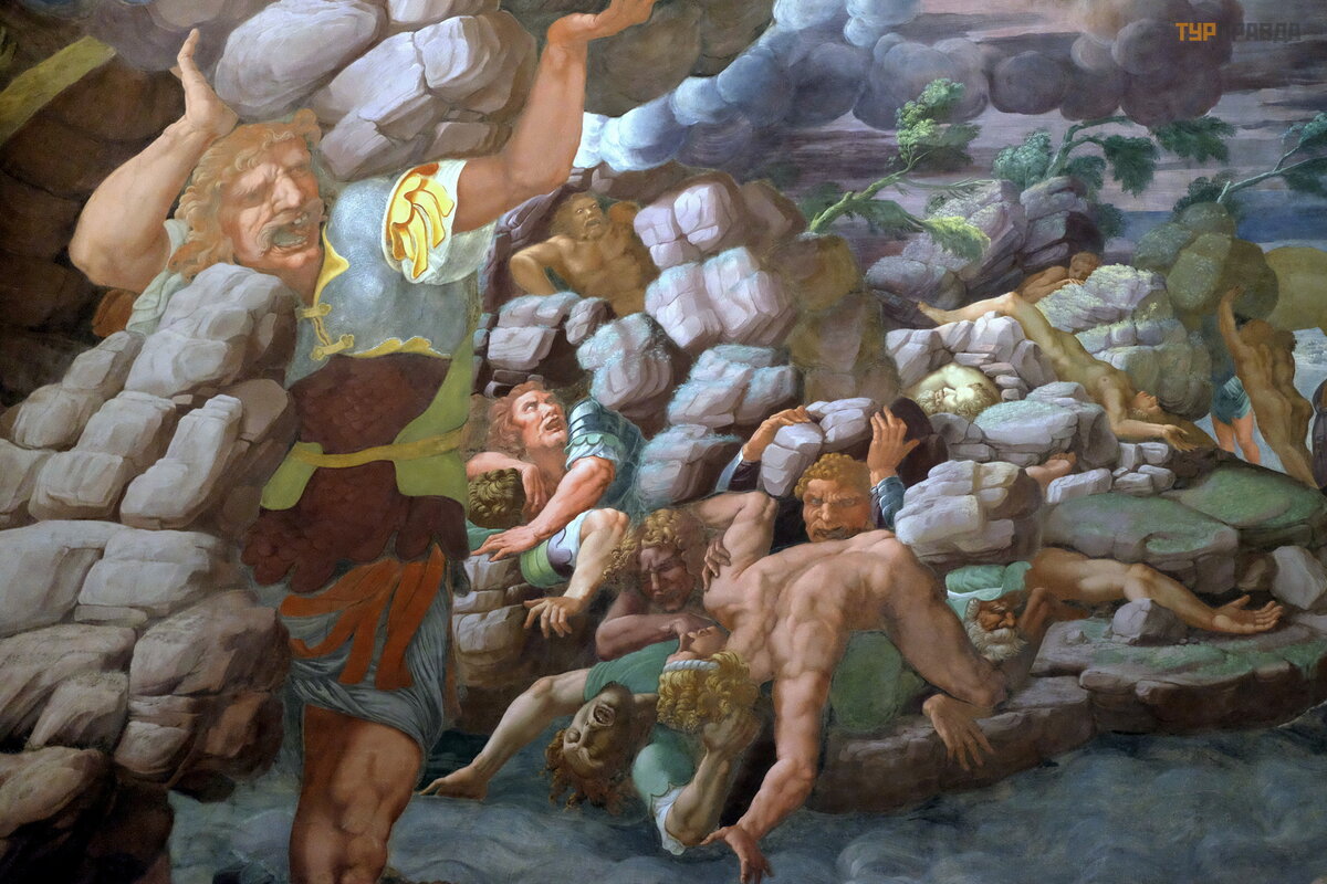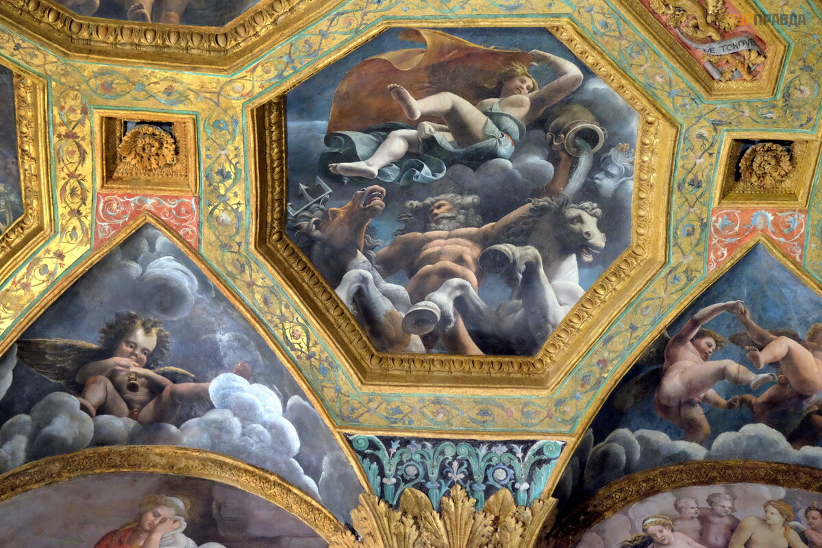 Зал Гигантов. Фрески рассказывают о восстании титанов против Зевса-Юпитера и их, титанов, уничтожении олимпийским владыкой. Боги и богини наблюдают с Олимпа.