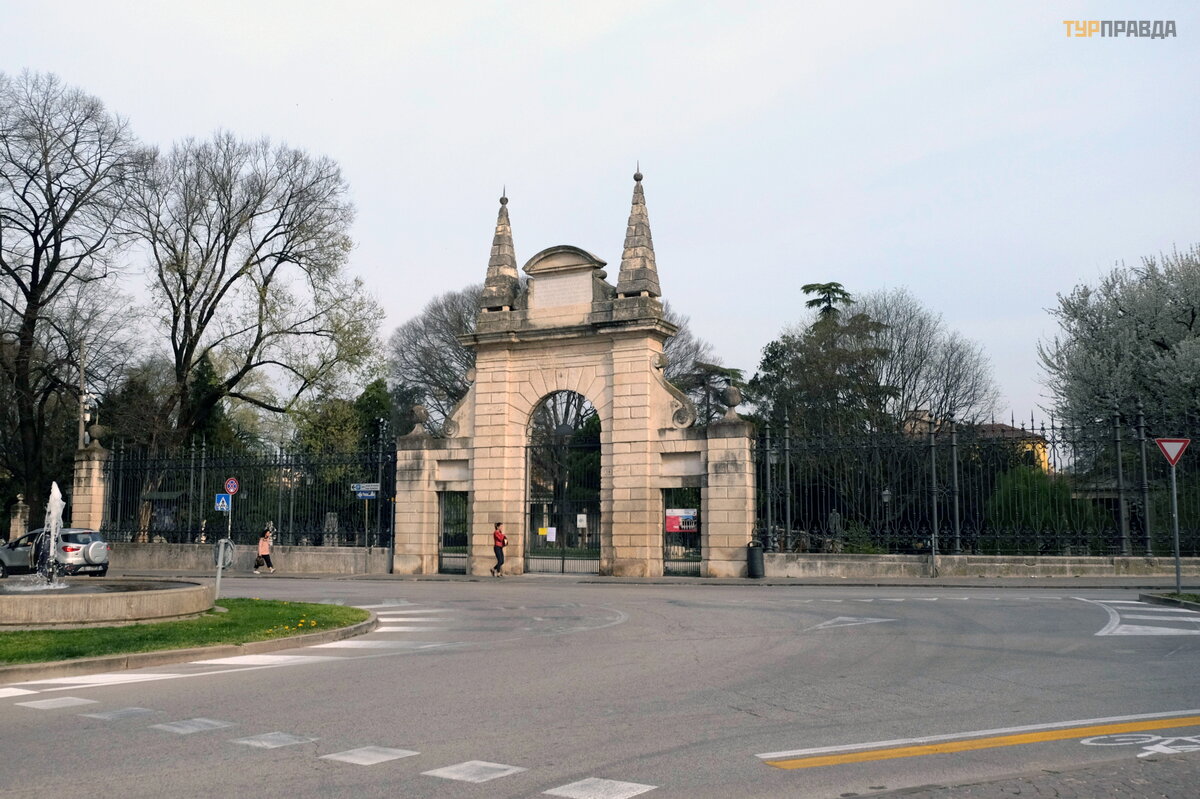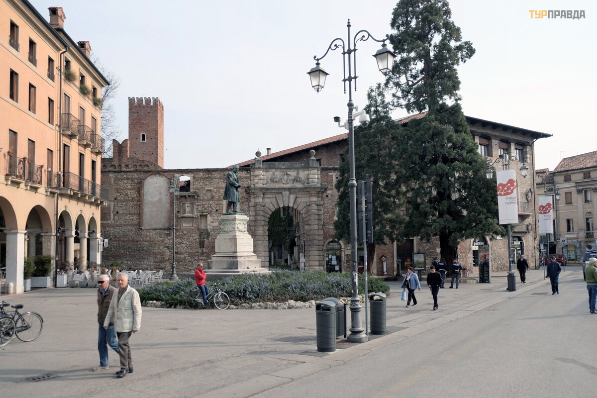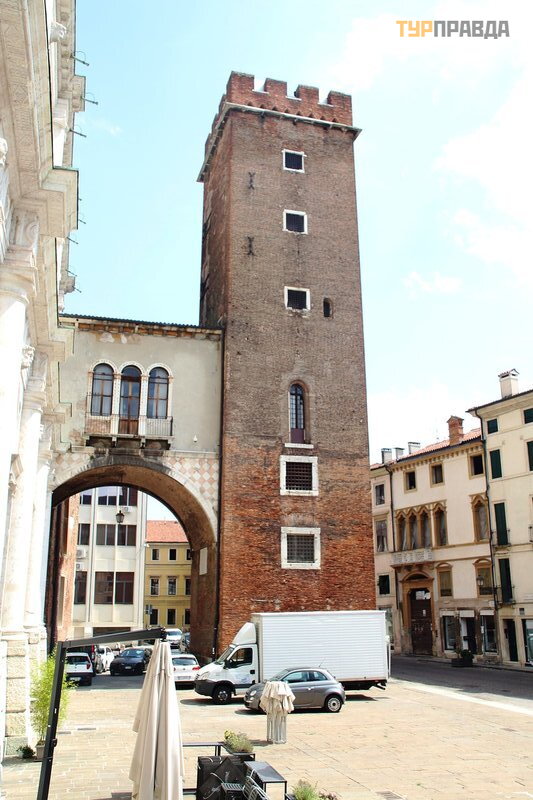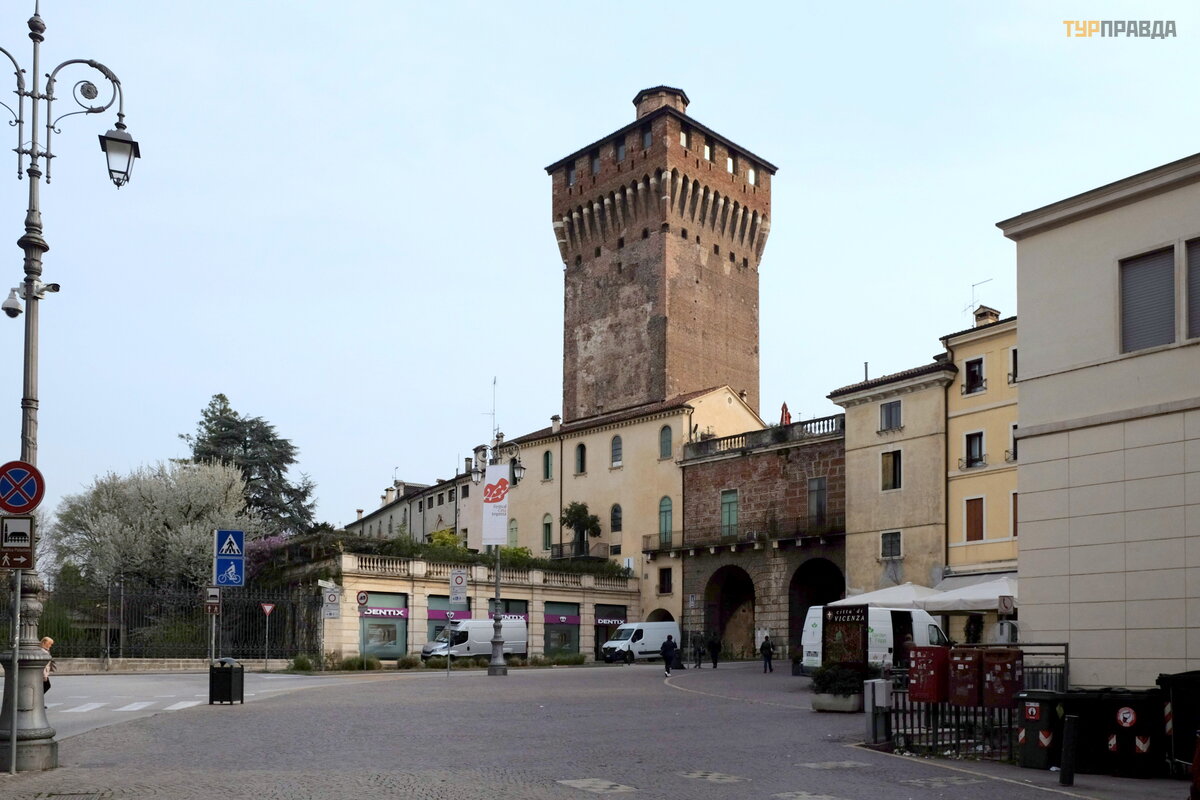 В Виченца мы приехали в 9 часов. От железнодорожного вокзала Виченцы к достопримечательностям города дорога ведёт через ворота Кастелло – Torrione di Porta Castello (XI-XV вв. ). Ворота (не только эти, но и ещё несколько в разных частях города), естественно, остались от городских оборонительных сооружений. А эта башня – единственное, что осталось от когда-то существовавшего здесь ещё до начала постройки стен замка. Отсюда и название.