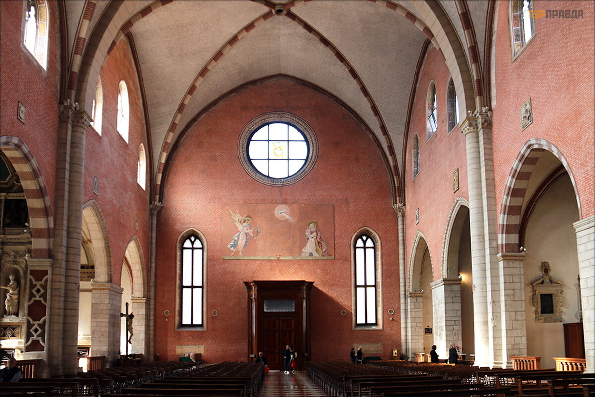 В XV веке церковь перестроили и расширили, а богатый интерьер с алтарем, украшенным мраморными, коралловыми и перламутровыми инкрустациями украсили своеобразными часовнями. В церкви был похоронен и сам Палладио в семейной могиле, но в 19 веке решили торжественно перезахоронить его череп с самыми большими костями (каким-то образом выделили среди прочих останков) на Монументальном кладбище Виченцы, поставили памятник и сделали могилу своему знаменитому гражданину.