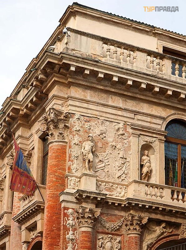 Напротив Базилики стоит еще один шедевр Палладио – Лоджия дель Капитанио (т. е. венецианского военного наместника). Лоджию начали строить в 1565 г. , а закончили в 1572 г. , сразу после произошедшей годом ранее битвы при Лепант, где был разбит турецкий флот. По внешнему виду Лоджия дель Капитано похожа на римскую триумфальную арку, которую украшают изображения захваченных у турок трофеев.