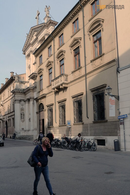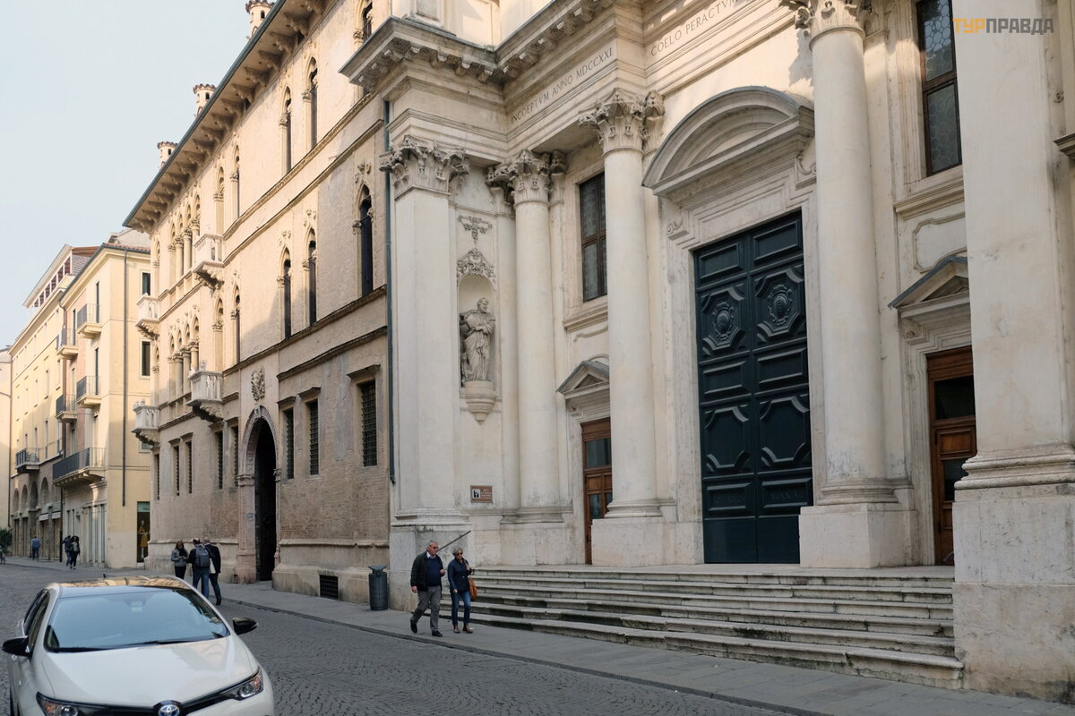 Театр находится на площади piazza Matteotti, где стоит еще один шедевр Палладио – Палаццо Кьерикати. В 1550 г. Палладио приступил к проекту дворца по заказу графа Джироламо Кьерикати. В то время нынешняя площадь Пьяцца Маттеотти была островком среди городских рек, поэтому Палладио спроектировал Palazzo Chiericati на небольшом возвышении. Как видно, весь первый этаж занимает лоджия. Боковые лоджии есть и на втором этаже. Сейчас здесь находится Городской музей, в котором собрана весьма достойная коллекция живописи. В частности здесь можно увидеть несколько картин Монтаньи, которого редкого можно встретить в других музеях, и еще более редкого Буонконсильо, чья « Пьета» считается признанным шедевром итальянского Ренессанса. Правда, для нас из-за недостатка времени все это осталось « за кадром» .