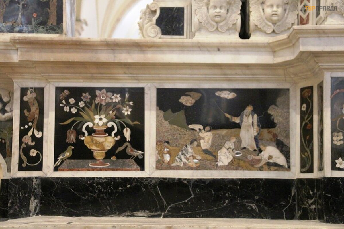 Алтарь датируется 1667-1669 годами, инструктации выполнены полудрагоценными камнями, флорентийским мастером Корбарелли, который в 1670-1671 гг. также построил храм над алтарем. Грандиозный комплекс стоит на трех ступенях, украшенный инкрустациями, геометрическими и цветочными мотивами.