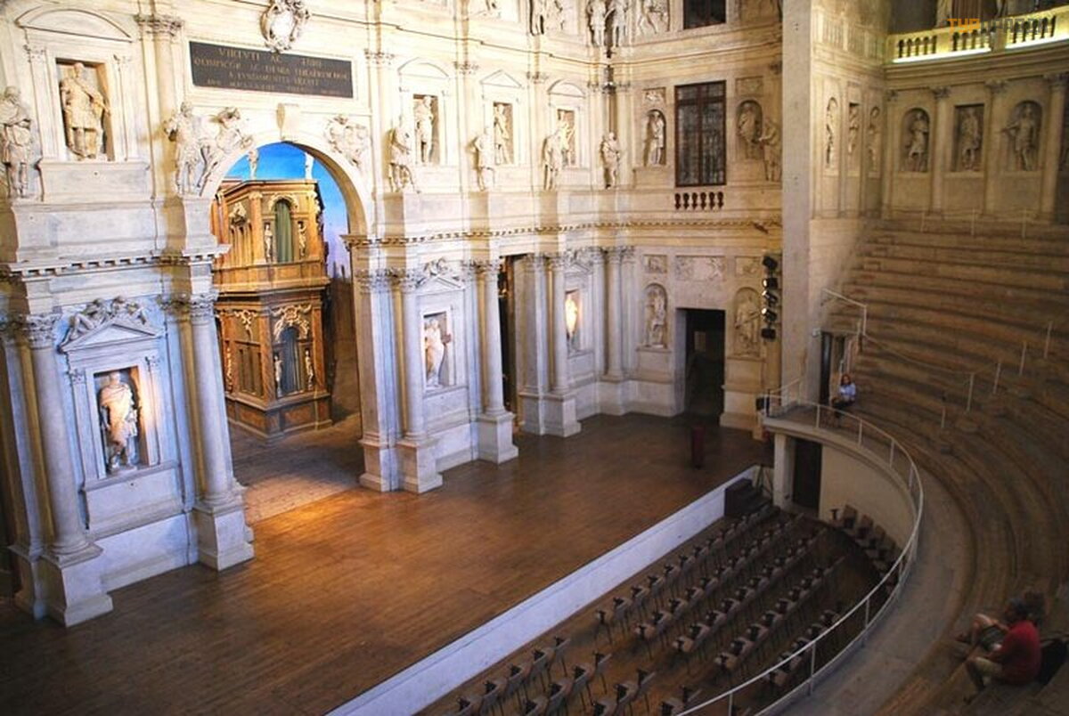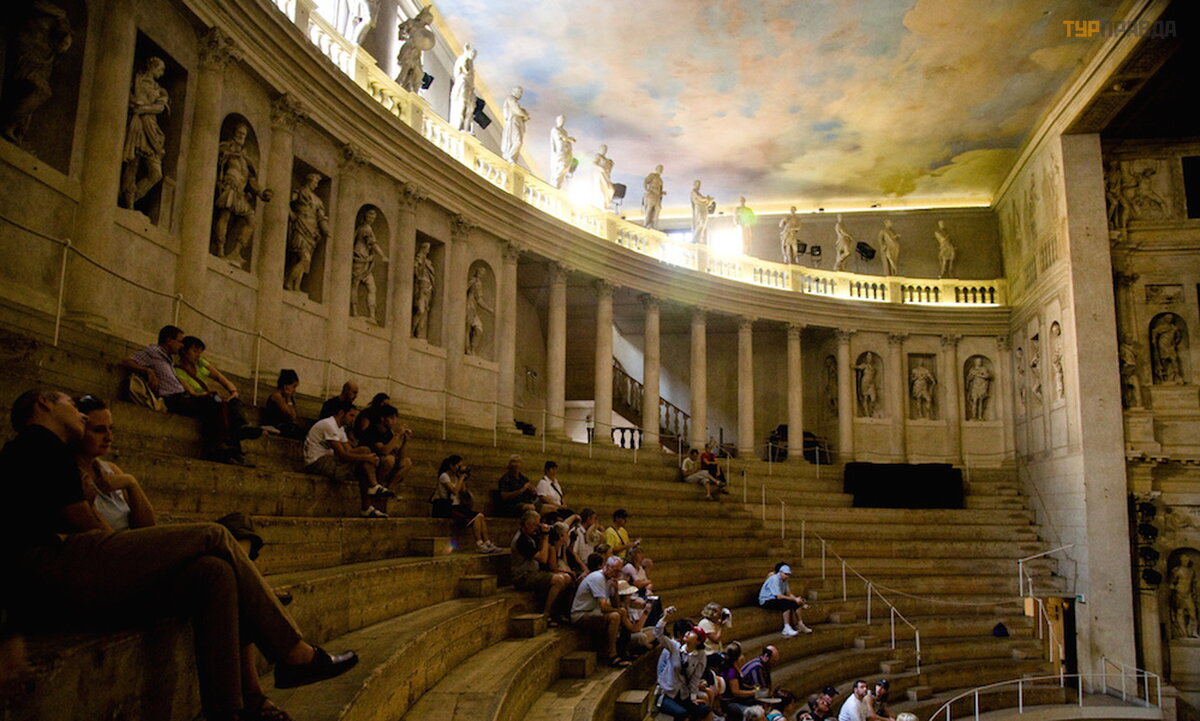 Teatras stovi senovinė s tvirtovė s Palazzo del Territorio vietoje. Teatras buvo pastatytas 1580–1585 m. ir tapo paskutiniu Palladio š edevru. Tiesa, Palladio sū nus Silla jau baigė teatrą , o tada architektas Vincenzo Scamozzi.