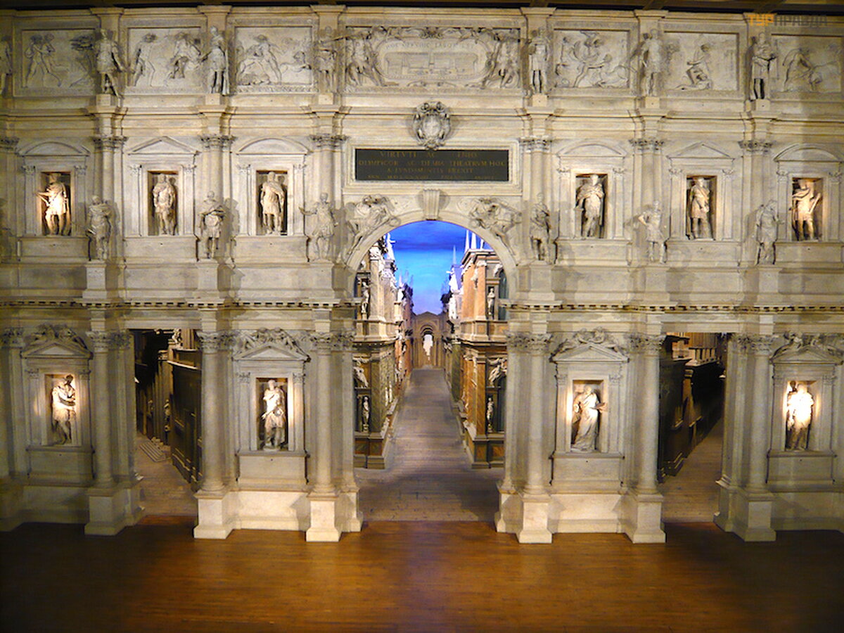 Созданные к первому спектаклю « Царь Эдип» в 1585 г. , они остались неизменными до наших дней. Сквозь центральную арку и проёмы видны уходящие вдаль средневековые улицы (города Фивы). Трудно поверить, что длина центральной улицы составляет всего 12 м. Иллюзия протяжённости создаётся поднимающейся « мостовой» , опускающимся « небом» и уменьшающимися « зданиями» . Для полного эффекта во время представления на заднем фоне находятся дети, одетые как взрослые, или лилипуты.