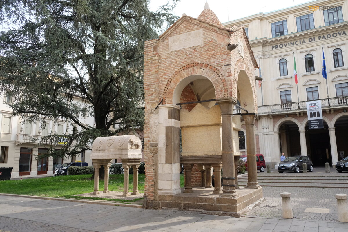 Sarkofagas ant aukš tų kojų priskiriamas Trojos Antenorui, kuris po Trojos ž lugimo sugebė jo gyvam iš trū kti iš miesto ir, pasiekę s š iuos krantus, į kū rė gyvenvietę , kuri vė liau tapo romė nų miestu, pavadinimu Patavium. 1274 m. buvo rasta arka su kario kū nu su kardu, apsirengusio senoviniais š arvais, ir jie nusprendė , kad tai ne kas kitas, o pats Antenoras. Netoliese yra maž as poeto dei Lovati sarkofagas, kuris buvo idė jos autorius su Anteker. Už sarkofagų yra Palazzo prefektū ra.