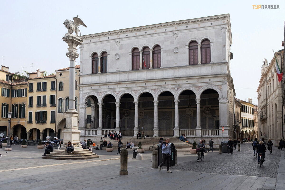 Piazza della Signori puoš ia fontanas ir kolona, vainikuota sparnuotu liū tu, Š v. Marko ir Venecijos simboliu,