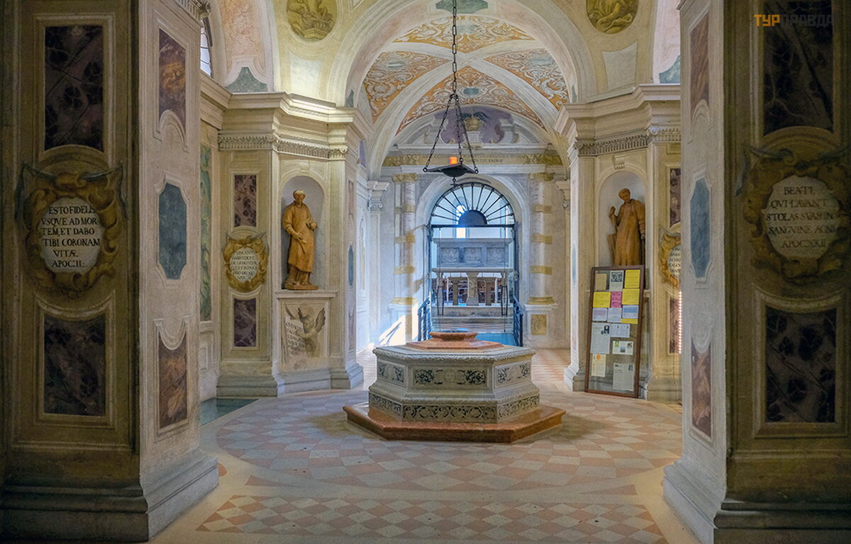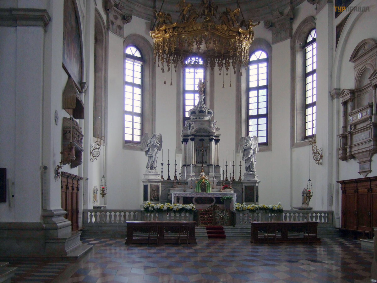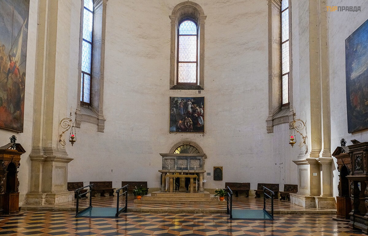 Virš Š v. Giustinos (Justinos) kapo yra altorius, o virš jo – Veronese paveikslas „Š v. Giustinos kankinystė “.