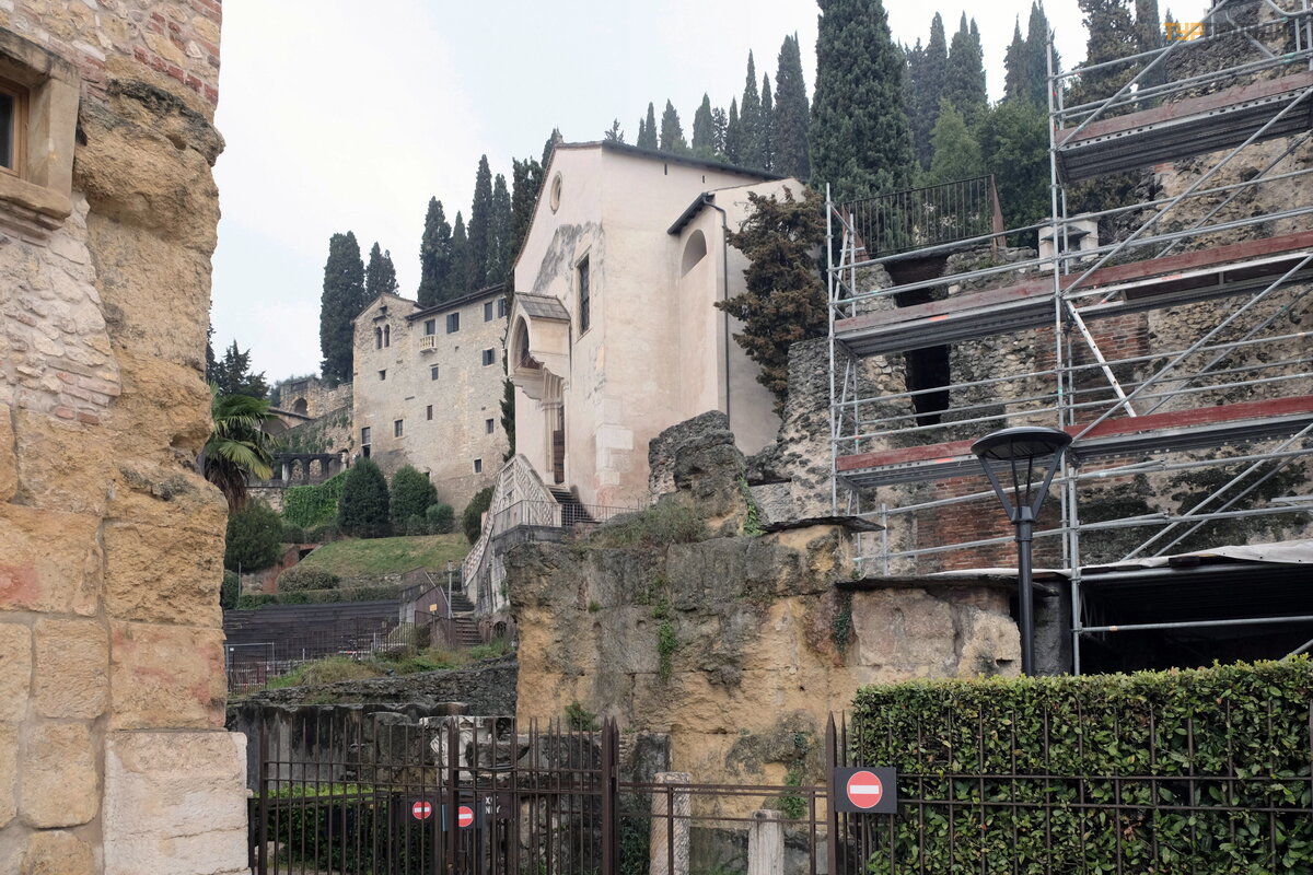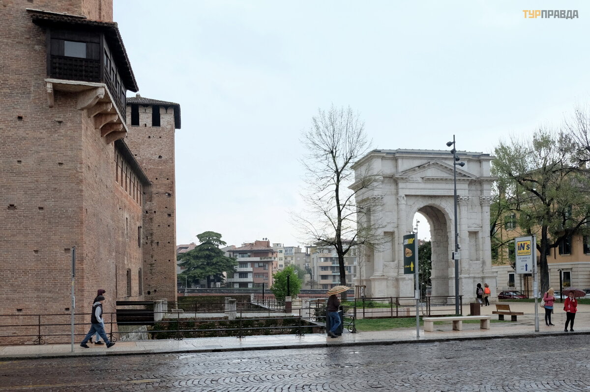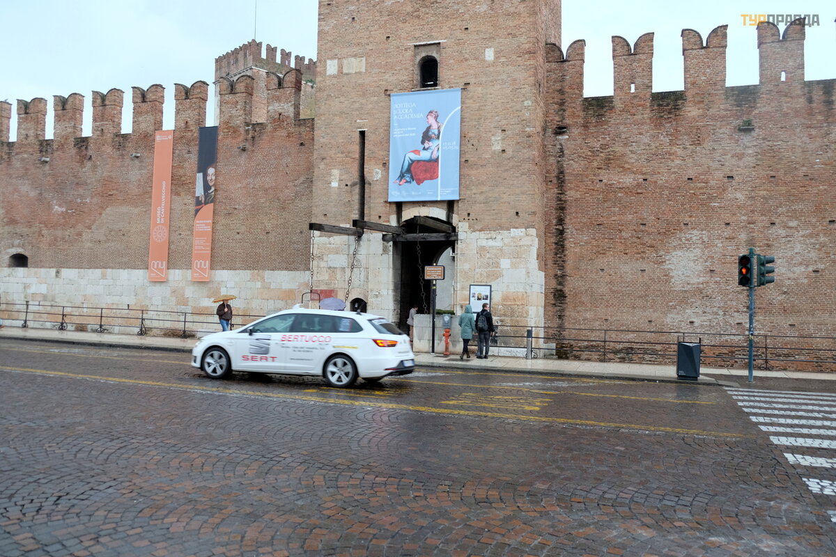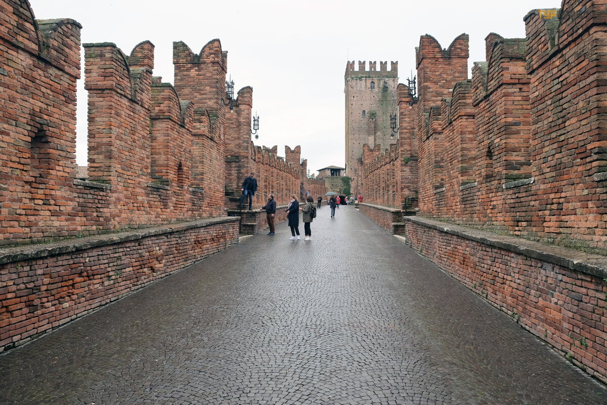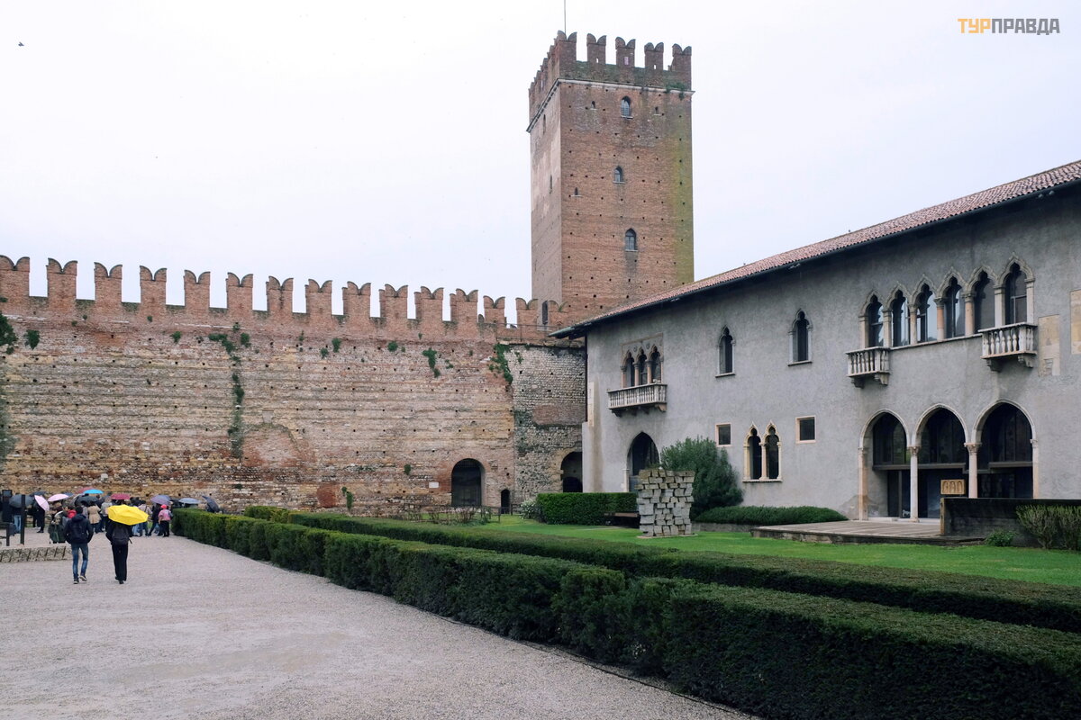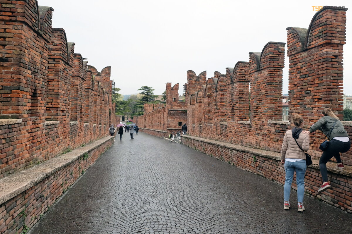 Kitą dieną oras pagerė jo, nors buvo debesuota, todė l iš vykome apž iū rė ti miesto toliau. Vė l į ž engė me į senamiestį pro Porta Palio vartus ir patraukė me į „seną ją pilį “ – Castelvecchio (Castelvecchio), kilusią iš Scaligeri eros, priklausiusią Della Scala š eimai. Tai milž iniš kų proporcijų kompleksas, į kurį į eina gynybinis tiltas su mū rais, iš mestais per Adidž ę .