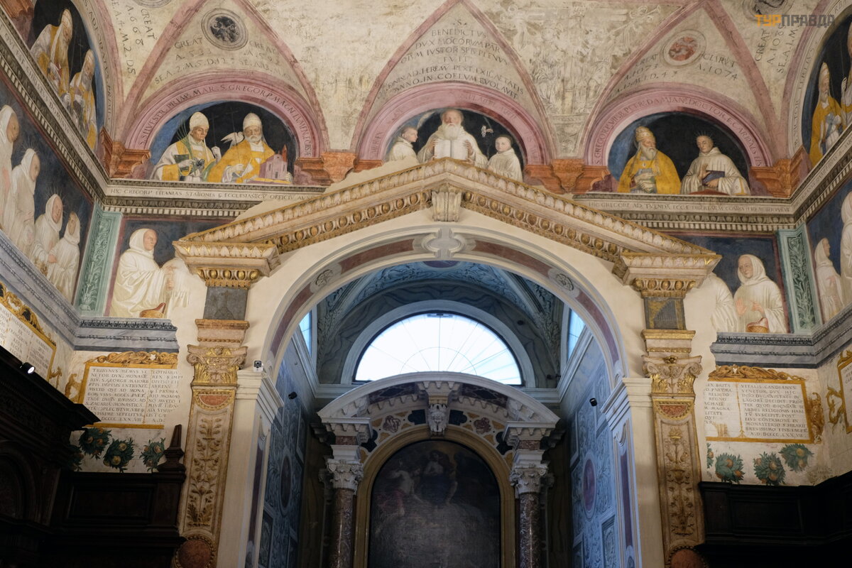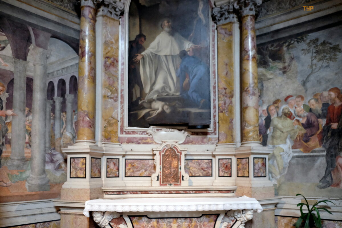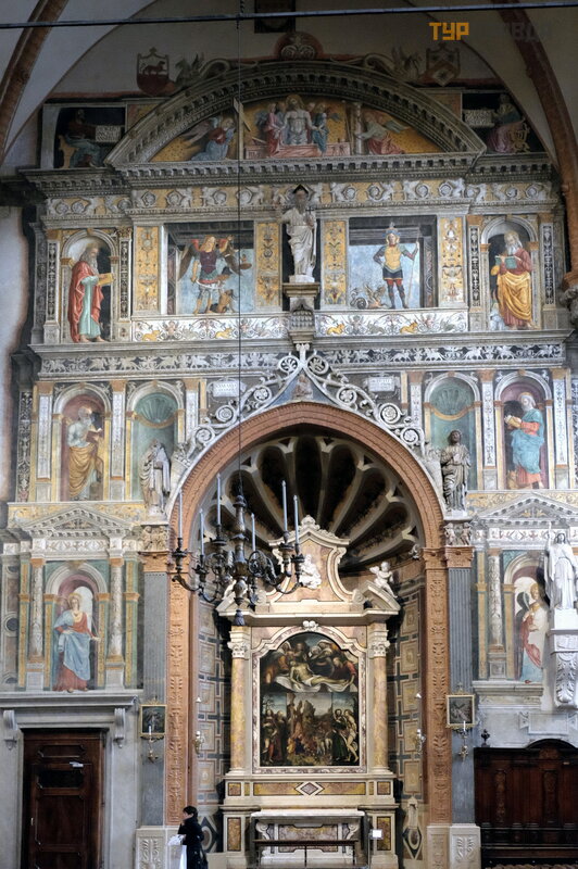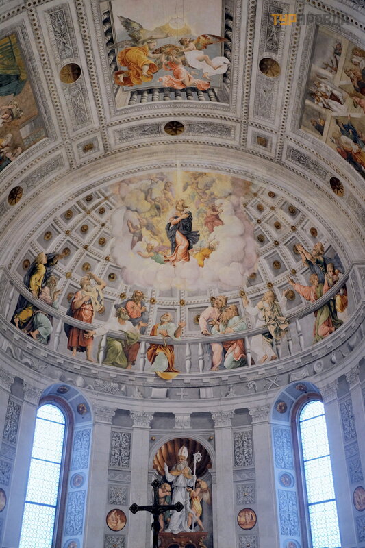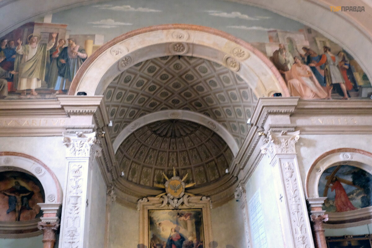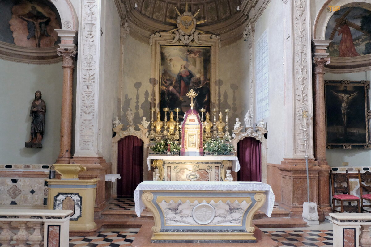 Apsidę puoš ia freskos „Apreiš kimas“, „Spektaklis š ventykloje“, „Gimimas“, Mergelė s Marijos ž emiš kojo gyvenimo epizodai, pranaš ų figū ros, XVI amž iuje tapytos Veronos tapytojo Francesco. Torbido pagal Giulio Romano kartoną .