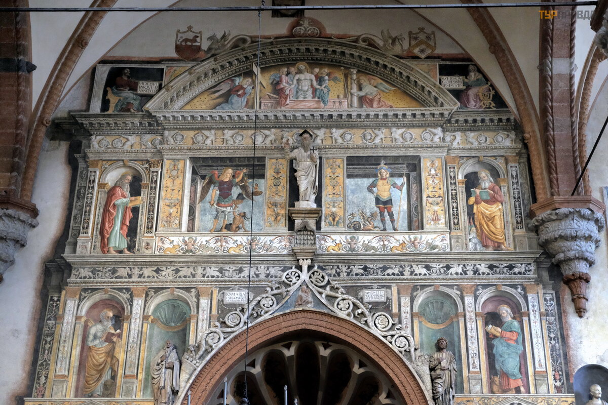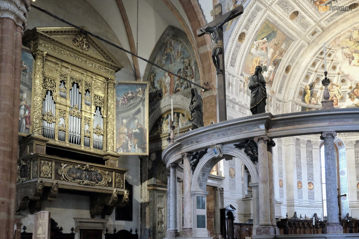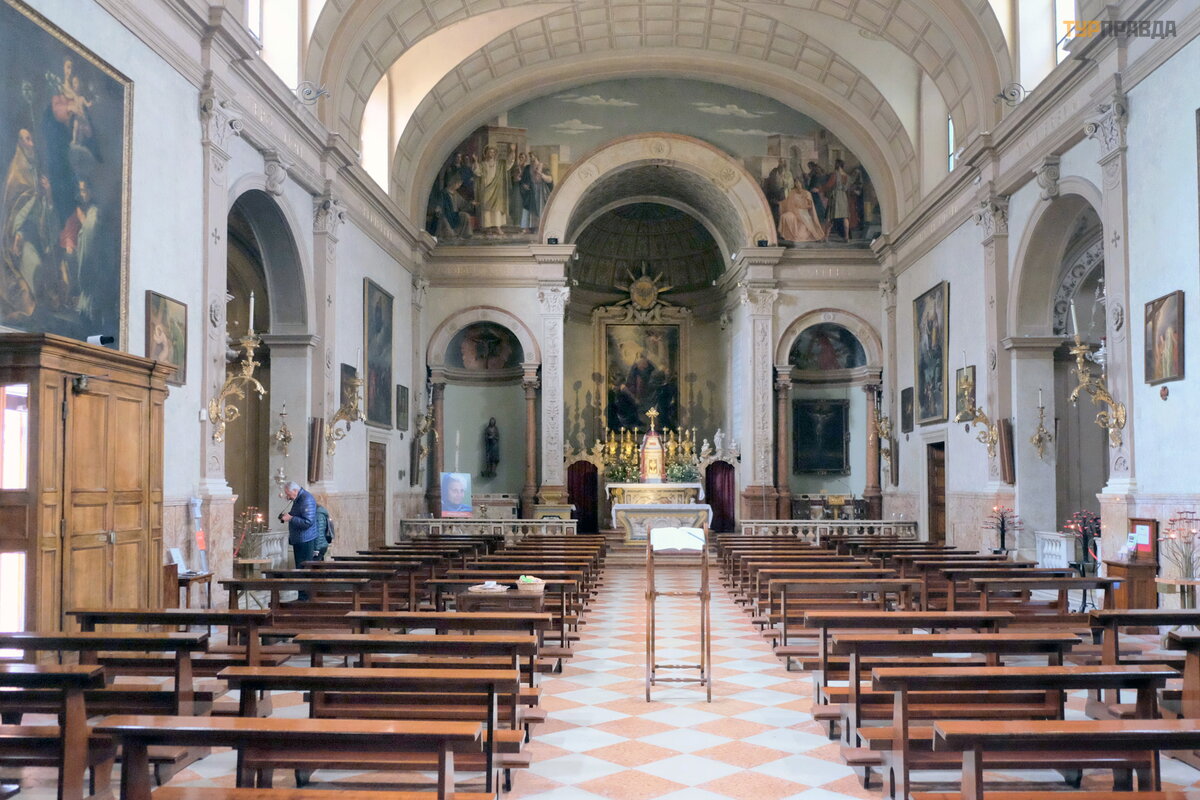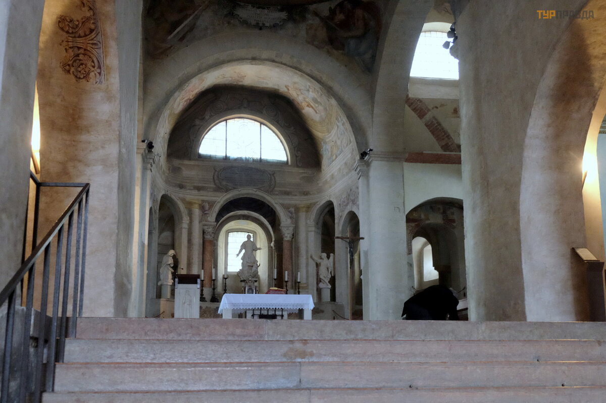 Ant baž nyč ios sienų galite pamatyti Nicolò Giolfino ir Francesco Caroto freskas. . .