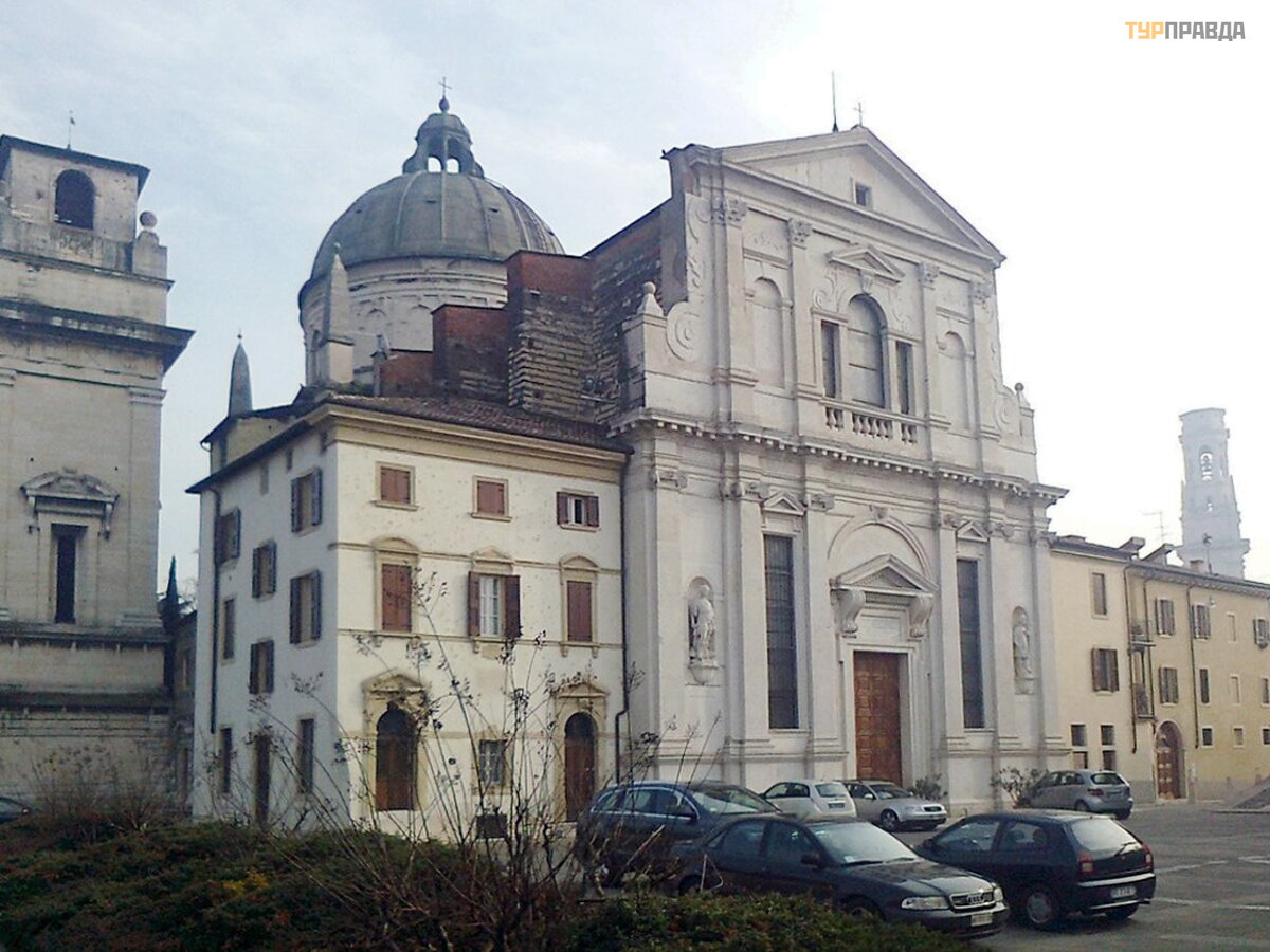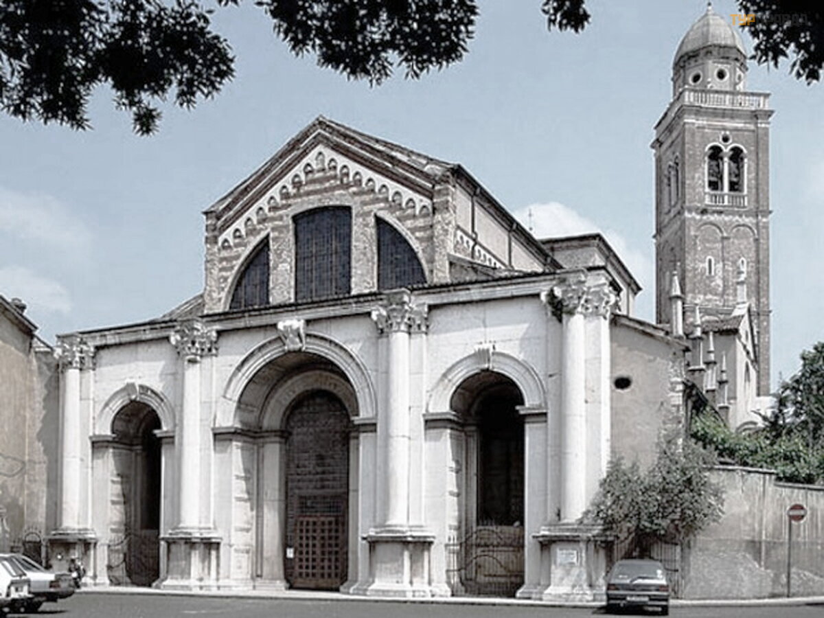 Pastatė benediktinų vienuoliai. 1533 metais š alia buvo pastatyta varpinė su 6 varpais, o XVI amž iaus pabaigoje architektas Michele Sanmicheli perstatė gotikinį fasadą klasikiniu stiliumi – pridė jo tris balto marmuro portalus.