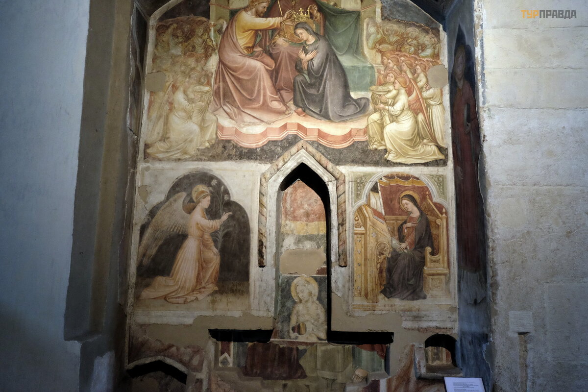 Baž nyč ios sienas puoš ia XIII–XV a. freskos ir paveikslai.