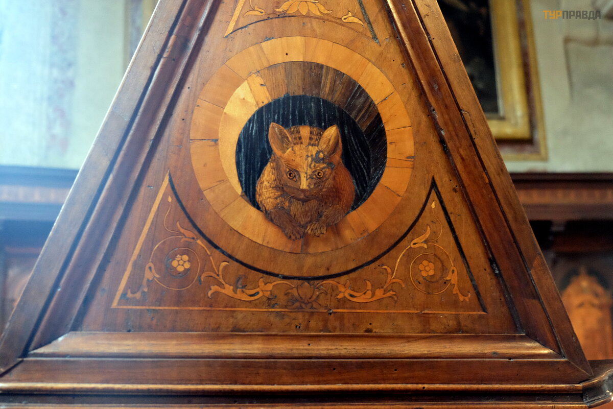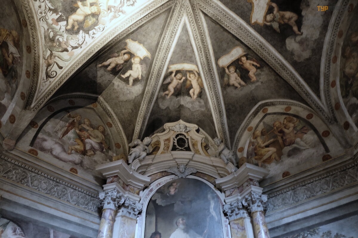 Interjerą puoš ia į vairių epochų freskos ir paveikslai.