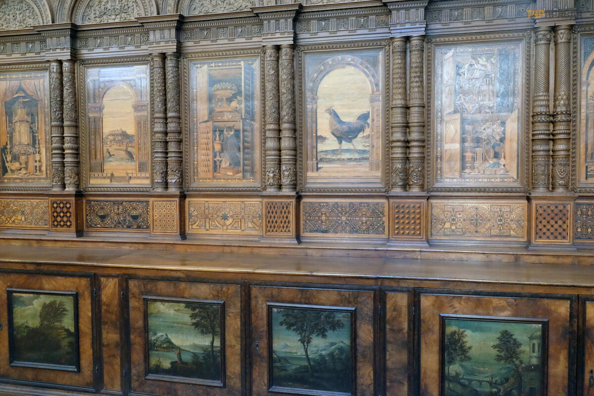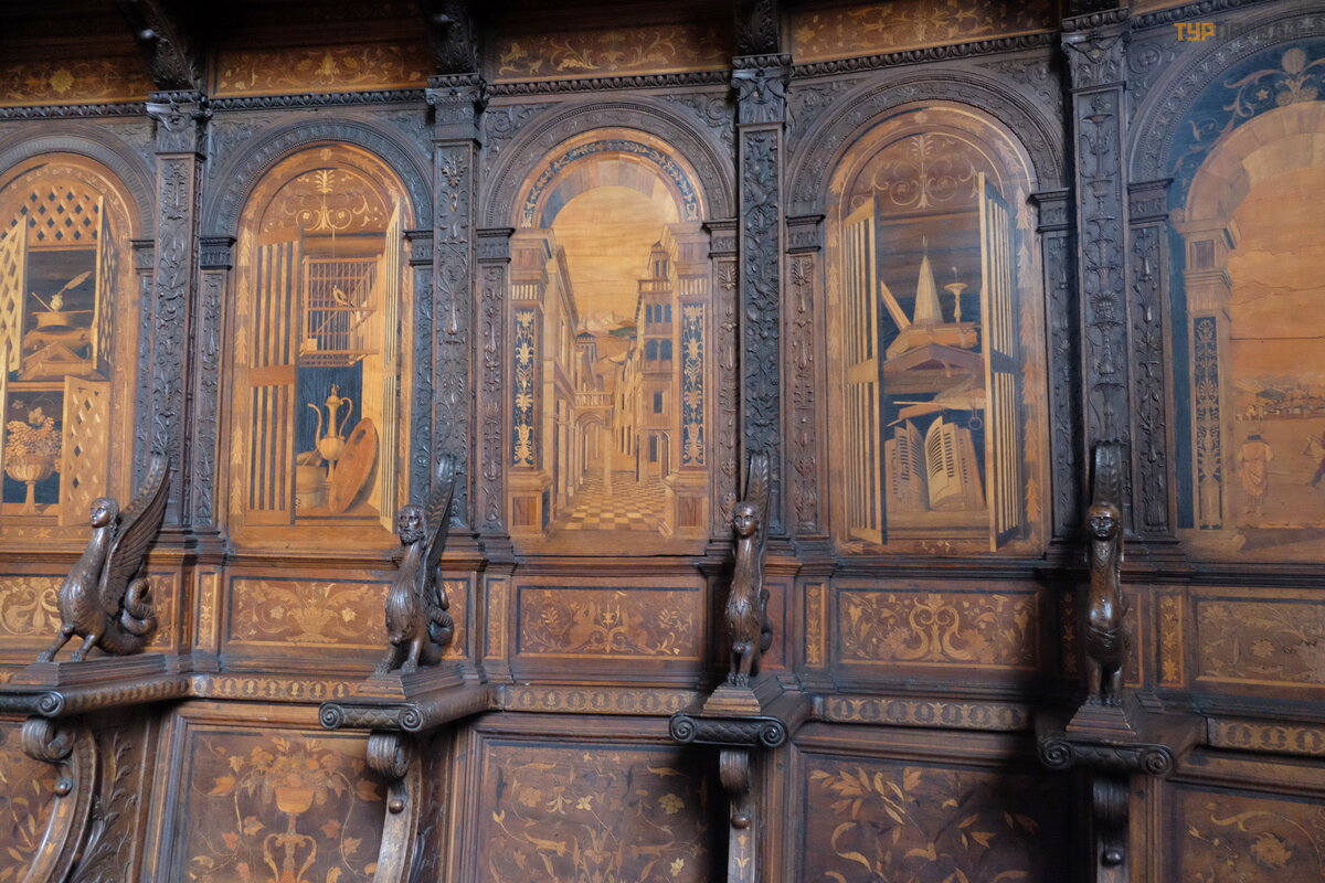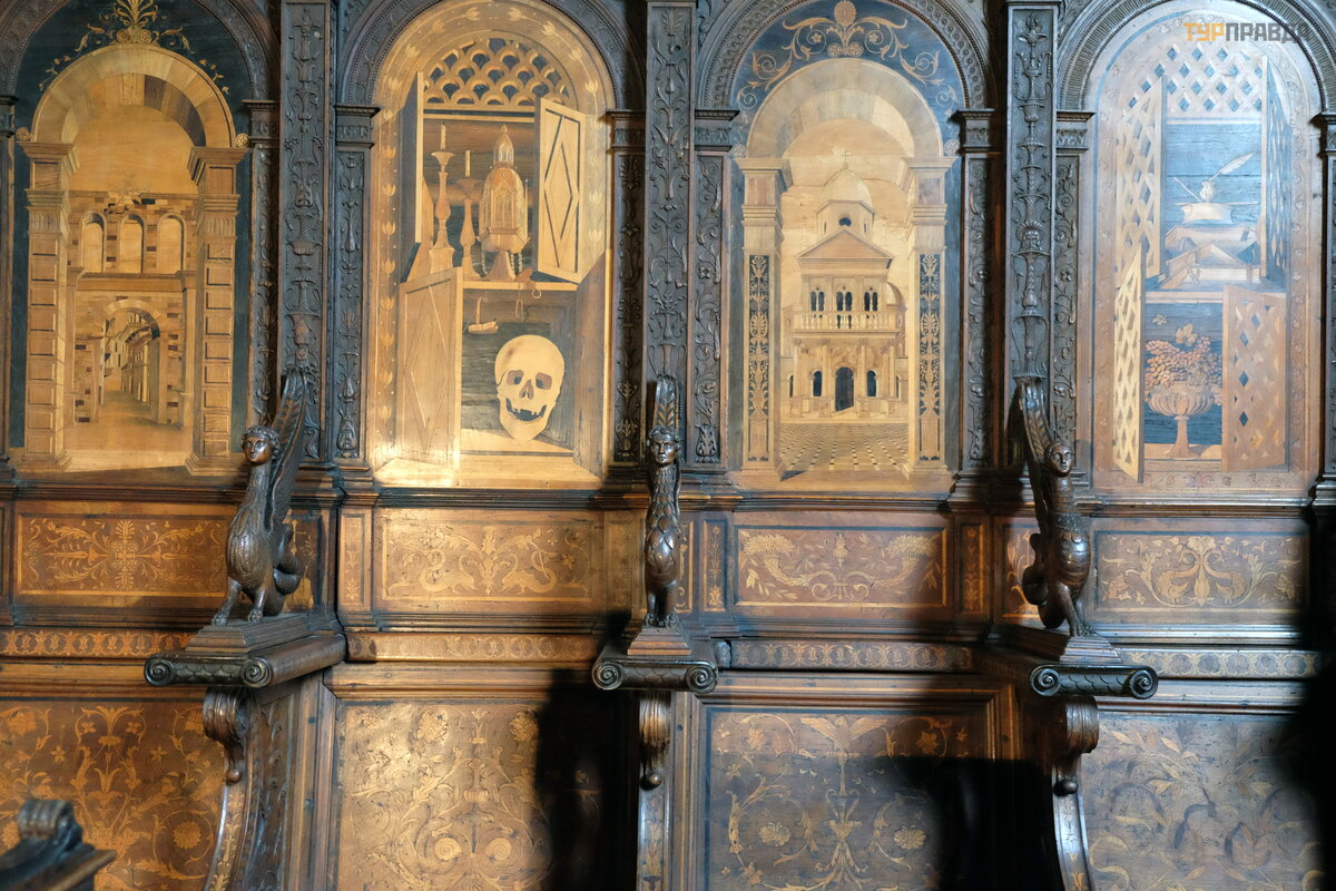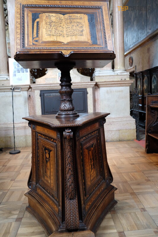 Baž nyč ia garsė ja tuo, kad XV amž iuje iš kilus menininkas, inkrustacijos meistras Fra Giovanni da Verona zakristijai iš raiž ė medinius choro gardus ir stasidijų kė des. Taip pat jas puoš ė peizaž ais ir natiurmortais.