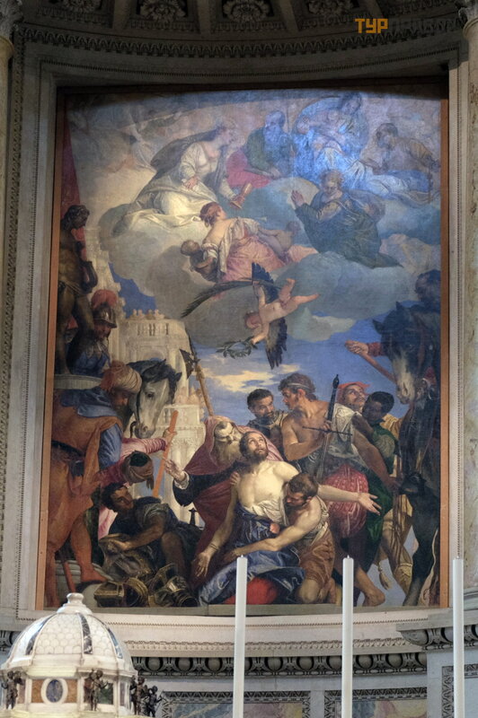 Baž nyč ią puoš ia š ie meno kū riniai: Veronese'o š ventojo Jurgio kankinystė pagrindiniame altoriuje. . .
