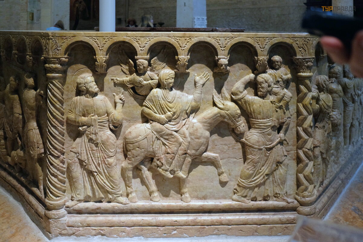 Krikš č ioniš kos temos pavaizduotos ant š rifto veidų bareljefų . Meno istorikai mano, kad š ių bareljefų autoriai buvo Brioloto, taip pat nulipdę s „Fortū nos ratą “ (rož inį langą ) San Zeno bazilikoje, ir kitas puikus skulptorius, matyt, priklausę s Venecijos-Bizantijos mokyklai.