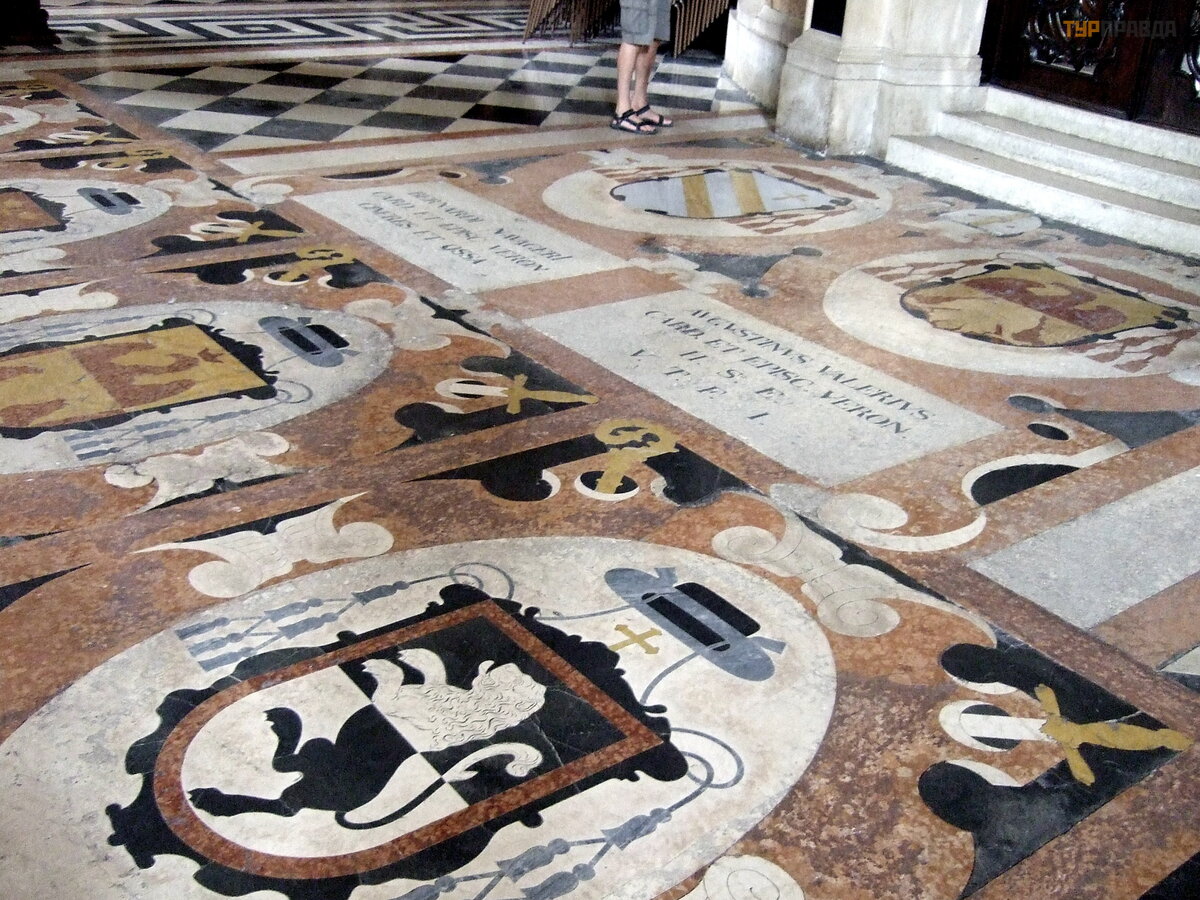 Grindys iš klotos baltais, pilkai mė lynais ir rausvais marmurais su griež tu geometriniu raš tu.