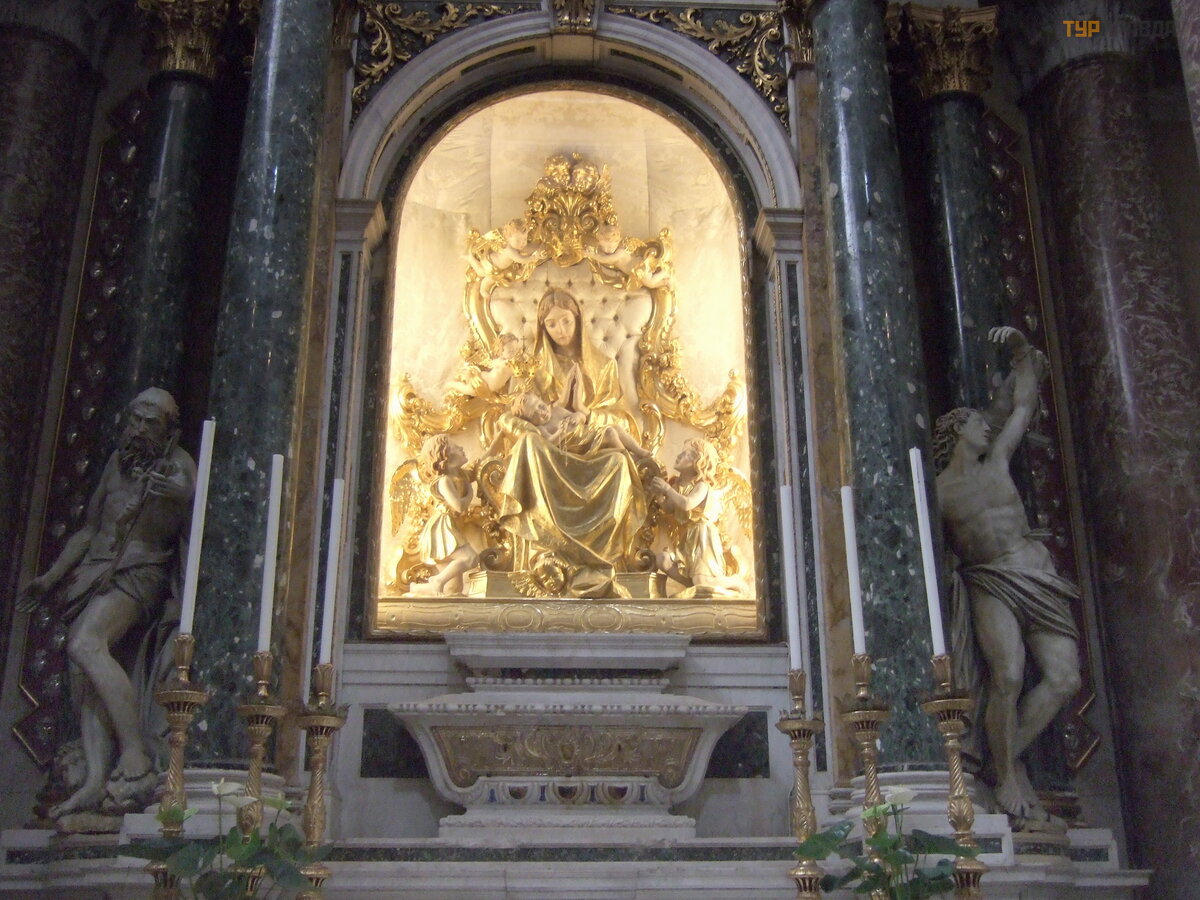 Č ia kiekvienas elementas yra tikras š edevras: raudono marmuro kolonos, nuostabū s skliautai su auksinė mis ž vaigž dė mis mė lyname fone, paauksuotas Mergelė s atvaizdas Madonna del Popolo koplyč ioje, tai yra „liaudiš ka Madona“.