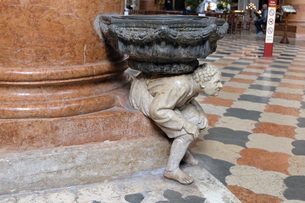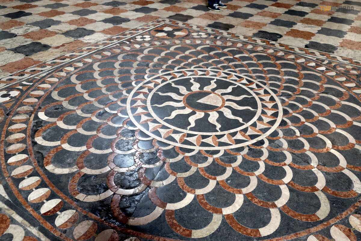 Mozaikines marmurines baž nyč ios grindis 1462 m. iš klojo Pietro da Porlezza iš balto, rausvo ir pilkai mė lyno marmuro.