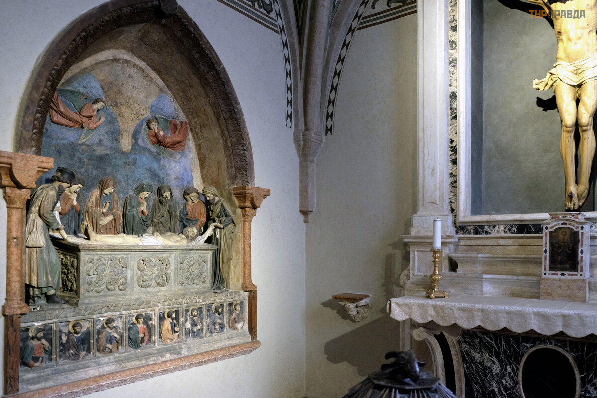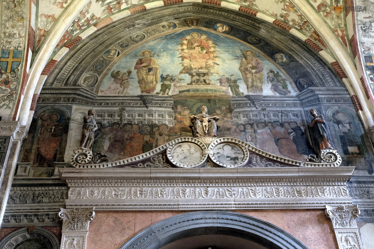 Pellegrini koplyč ios viduje yra 24 terakotos plokš tė s, kurias 1435 m. sukū rė Michele da Firenze, vaizduojanti Kristų ir š ventuosius.