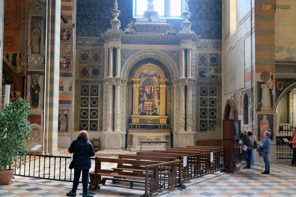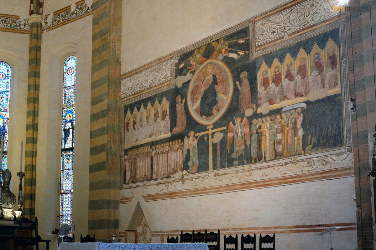 Pagrindinis bazilikos altorius, papuoš tas Paskutinio teismo (Turone, apie 1360 m. ) ir Apreiš kimo (Michele Gilambono, XV a. vidurys) freskomis.