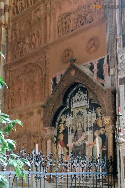 ant kurių pastatytos š ventų jų karių statulos, sauganč ios amž iną valdovų poilsį . Virš Consignorio ir Mastino II sarkofagų stovi dvi didingiausios arkos su stogeliais ir turtinga skulptū rine puoš yba.