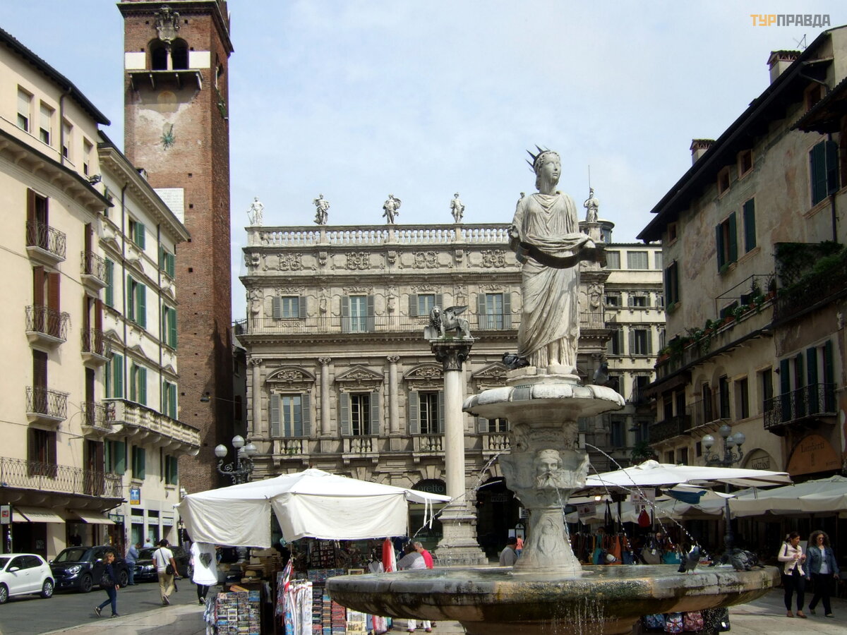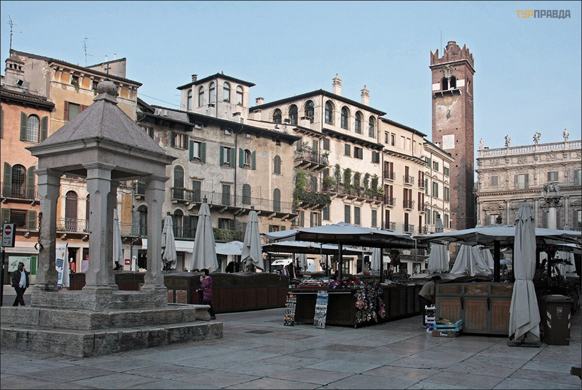 Piazza delle Erbe centre stovi Skaligerio eros gotikos š edevras – Veronos Madonos fontanas (Fontana Madonna Verona), į rengtas 1368 m.
