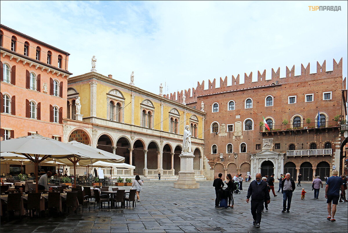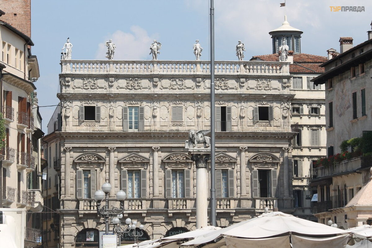 Praktiš kai visi aikš tė s pastatai yra sujungti vienas su kitu grakš č iomis arkomis, kurių viena ribojasi su Sovietų lodž ija. Geltonasis pastatas – rū mai Palazzo del Consiglio(Palazzo del Consiglio) arbaSovietų lodž ijapastatyti 1475–1492 m. Š is pastatas, labiau ž inomas kaip Loggia di Fra Giocondo, yra vienas geriausių ir į mantriausių Veronė s architektū ros pavyzdž ių .
