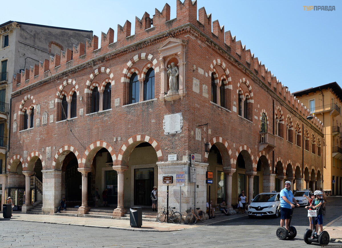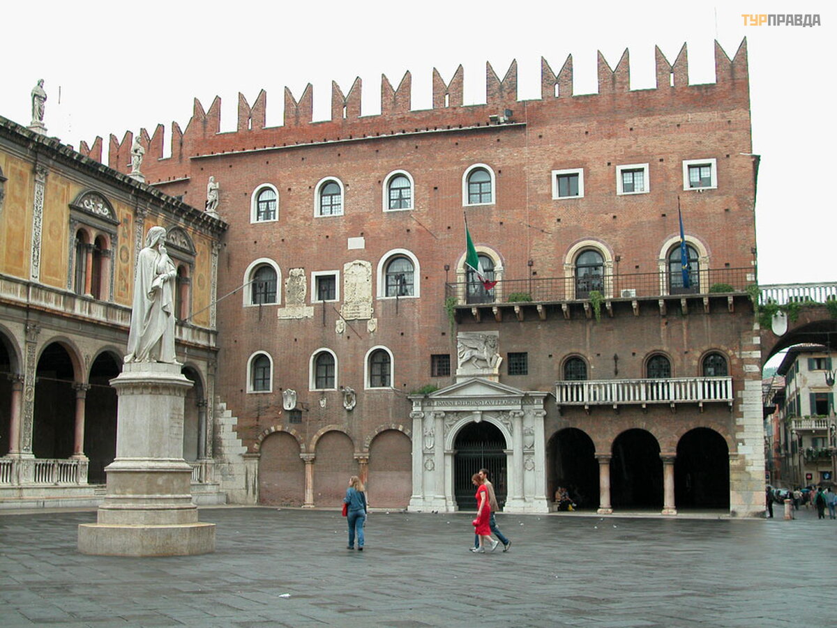 Palazzo Comunale (Palazzo della Comunale) susiduria su skirtingais fasadais Piazza delle Erbe, Piazza dei Signori ir Senojo turgaus kiemu. Fasadas, nukreiptas į Piazza delle Erbe.
