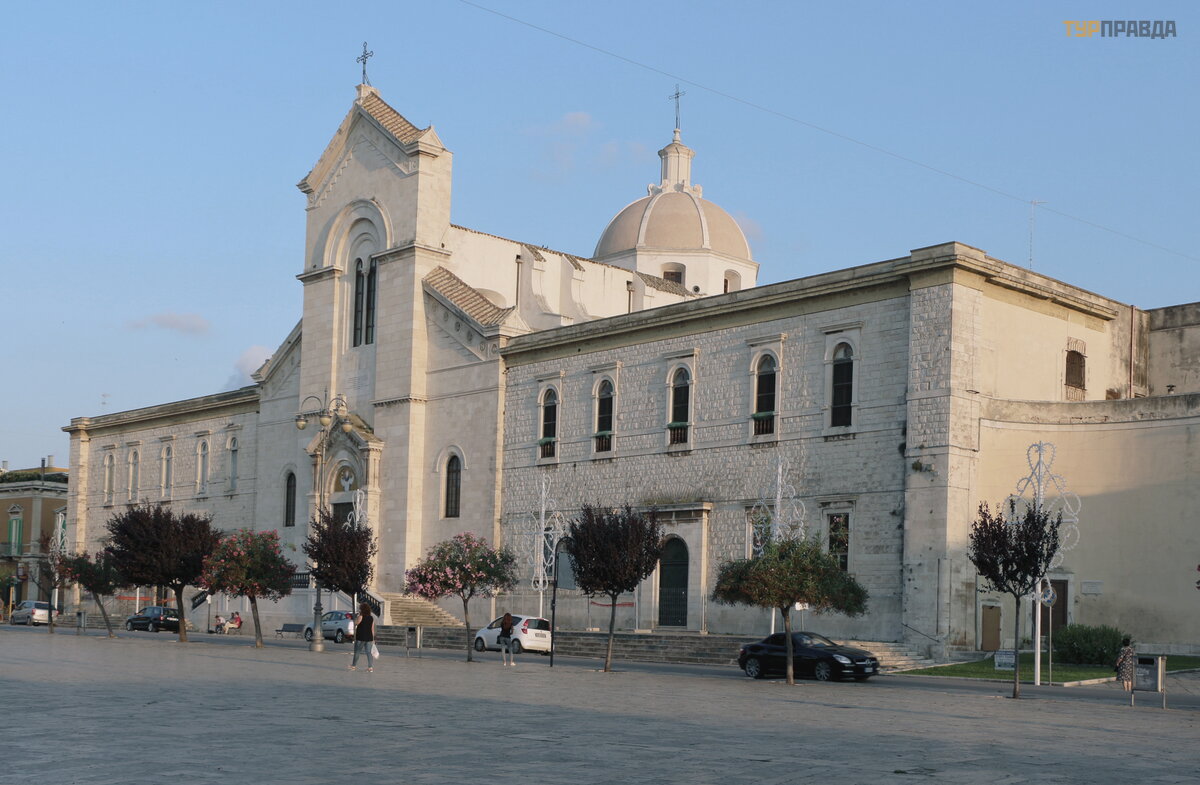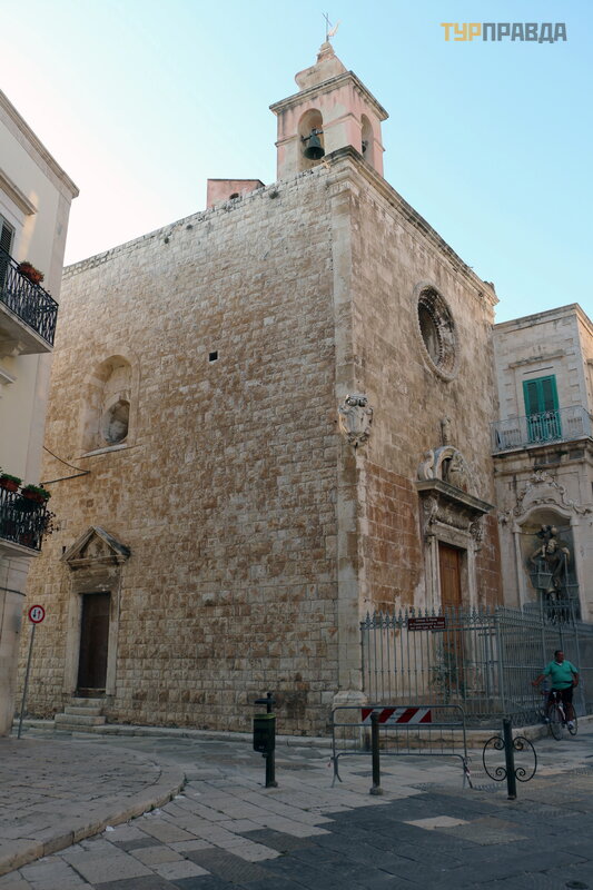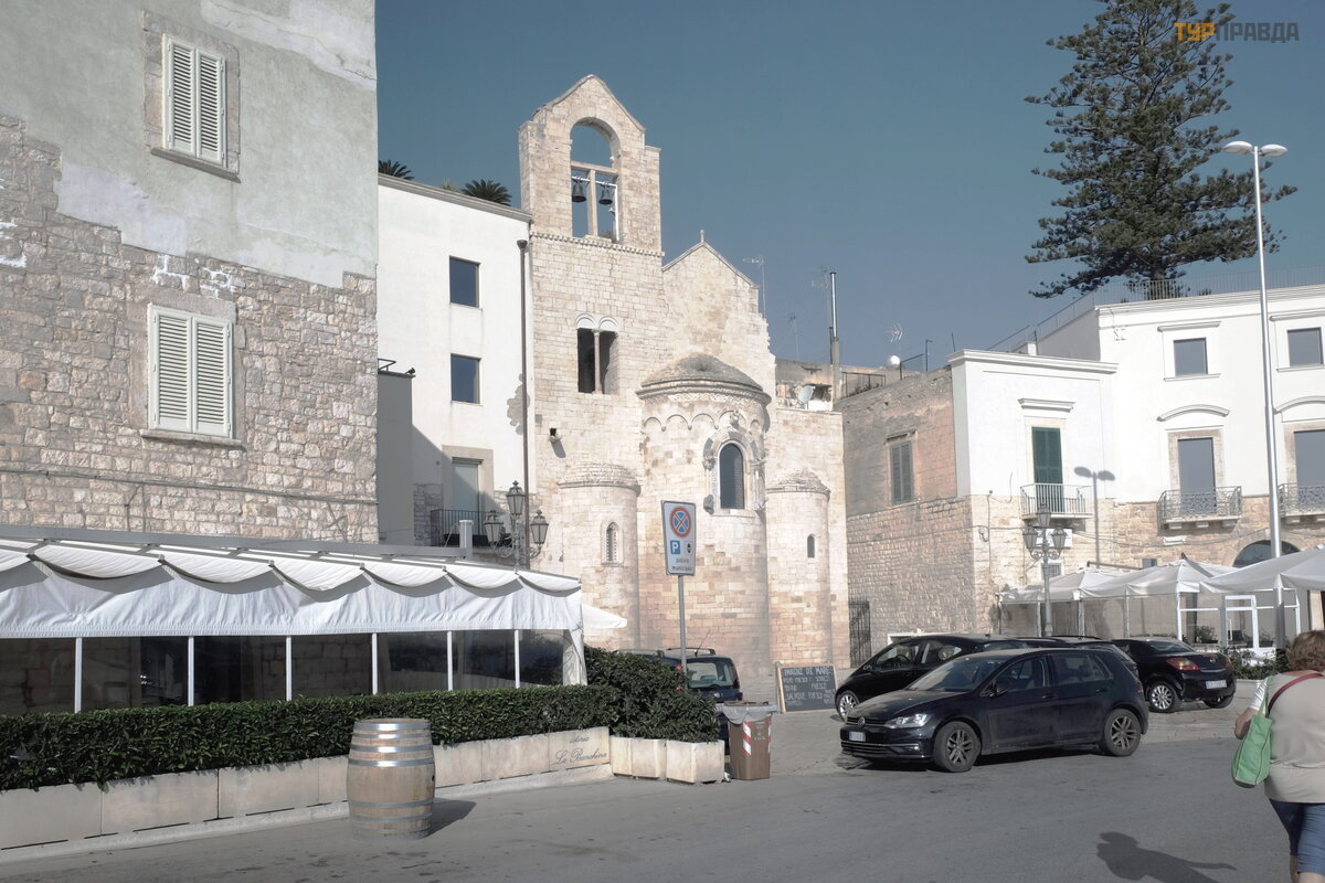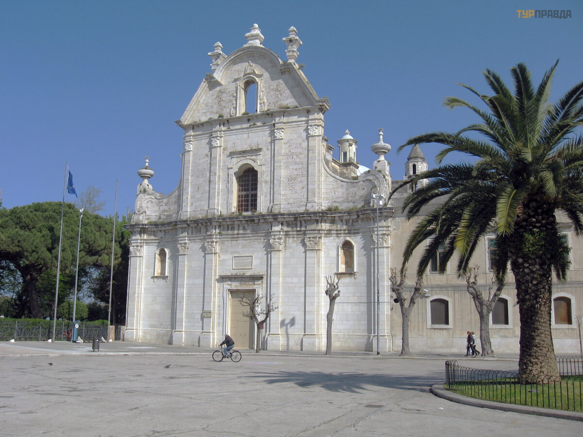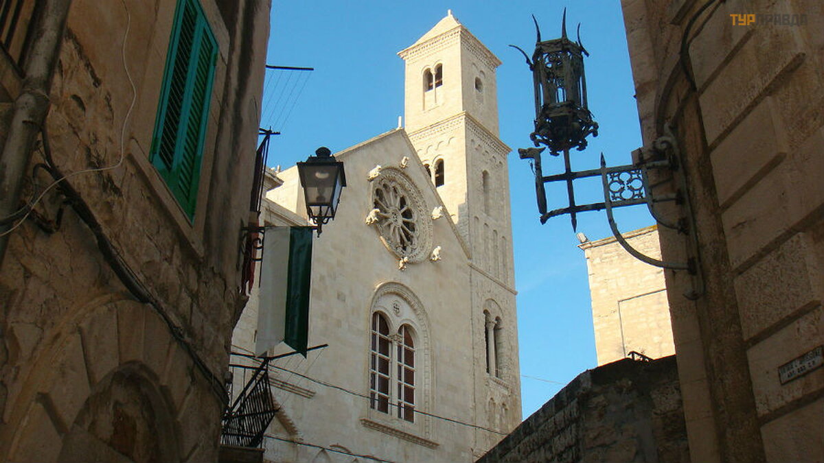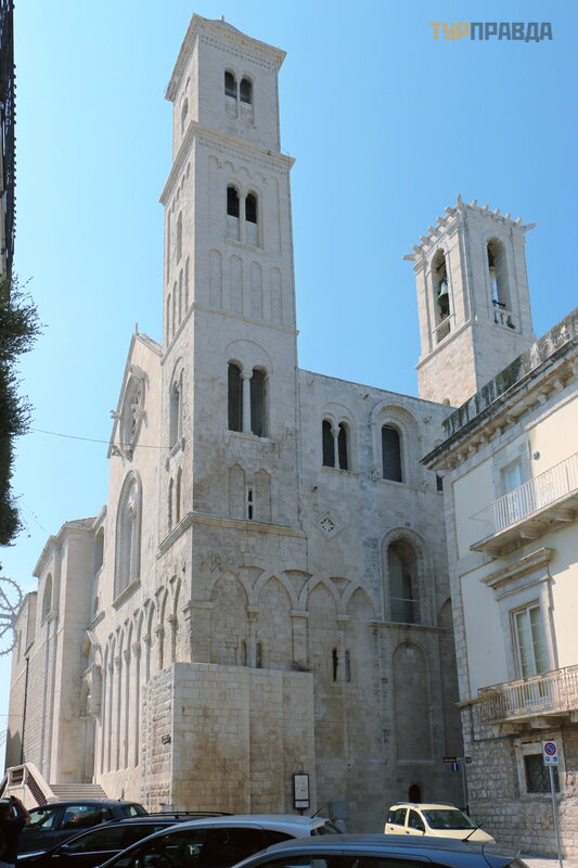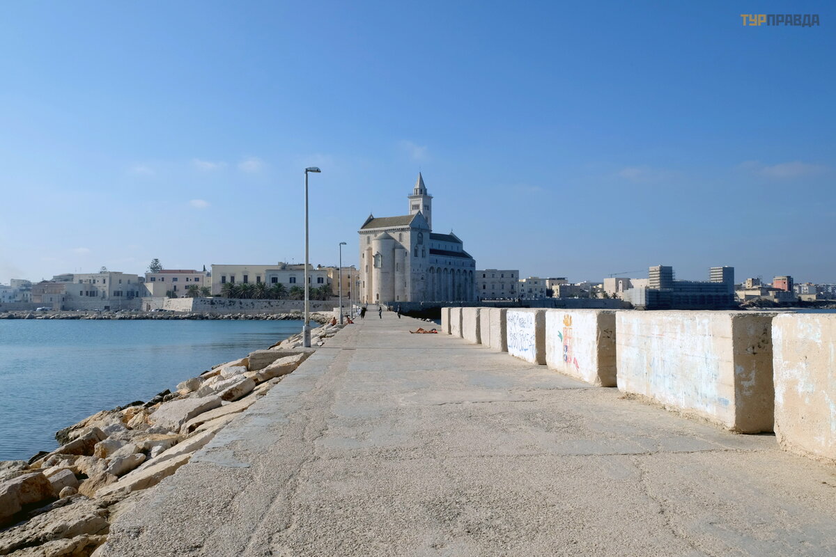 "Niekur kitur Europoje nerasite tiek daug vienas š alia kitos stovinč ių normanų katedrų . Deš imt mylių nuo Bario yra Dž ovinaco katedra, pastatyta 1283 m. Dar 2 mylios ir jau esate graž iojoje Molfetoje. laistyti balta katedra su trimis kupolais ir dviem varpinė mis atsispindi už.8 mylių , o Bisceglie sveikina jus su XII amž iaus katedra Nepatingė kite, eikite dar 5 mylias, pamatysite Trani katedrą (1096 m. ) ir tikrai pasigrož ė site jos didingumu. bronzinė s durys Kaip ir Molfetta ", ji stovi prie jū ros. Tie, kurie nuvaž iuos dar 10 mylių , atsidurs pakrantė s mieste Barletta. Vietinė katedra buvo pastatyta 1139 m. Bet nuo č ia iki Bario yra apie 35 mylios. "
