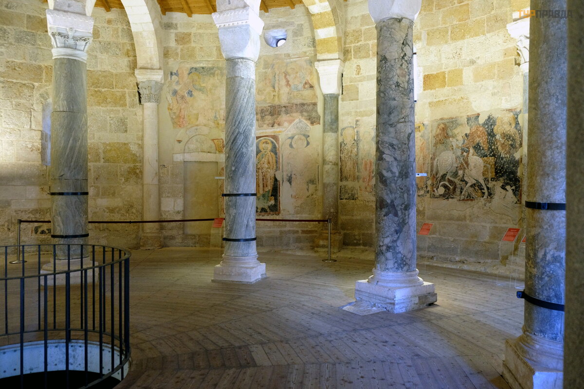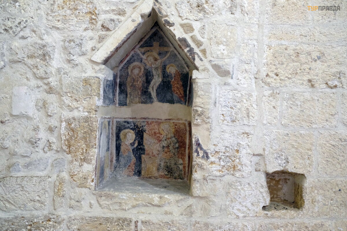 Ant baž nyč ios sienų galite pamatyti XIII–XIV amž ių freskų fragmentus: