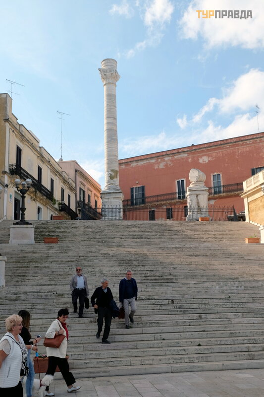 kurių virš uje yra senovė s romė nų kolonos – miesto simbolis, ilgą laiką tarnavę s jū reivių gidu. Senovė je jie ž ymė jo Appijos kelio pabaigą . Viena iš kolonų nulū ž o per ž emė s drebė jimą.1528 m. , o po š imtmeč io jos fragmentai buvo pasiū lyti kaimyninei Leč ei, kur jie pastatė koloną Š v. Oroncijaus garbei.