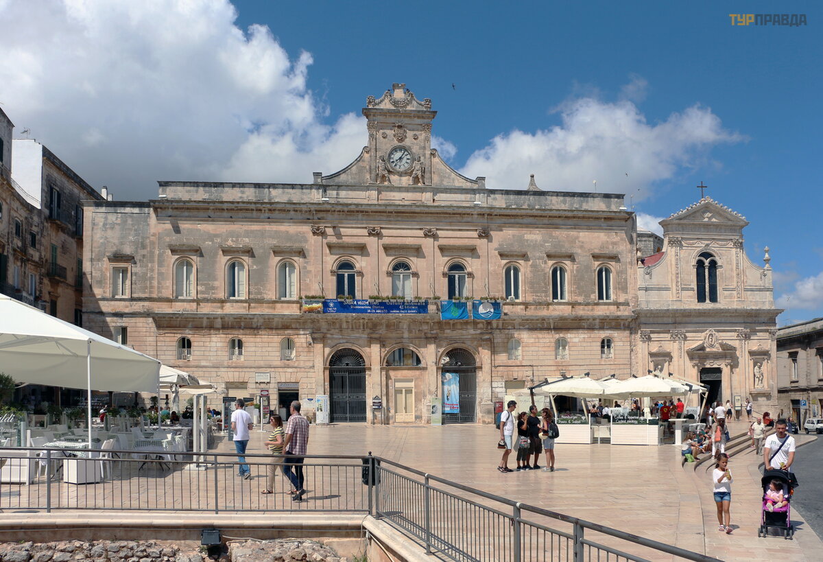 Miesto centras – Laisvė s aikš tė (Piazza della Libertà ). Č ia yra miesto administracijos rū mai (Palazzo del Comune), iš pradž ių buvę pranciš konų vienuolynas. Taip pat aikš tė je, kaip ir Leč ė je, iš kyla Š v. Oronzo smailė (Guglia di Sant'Oronzo) 1771 m. , kartu su š ventuoju globė ju, kuris saugo ir saugo miestą nuo rū pesč ių .