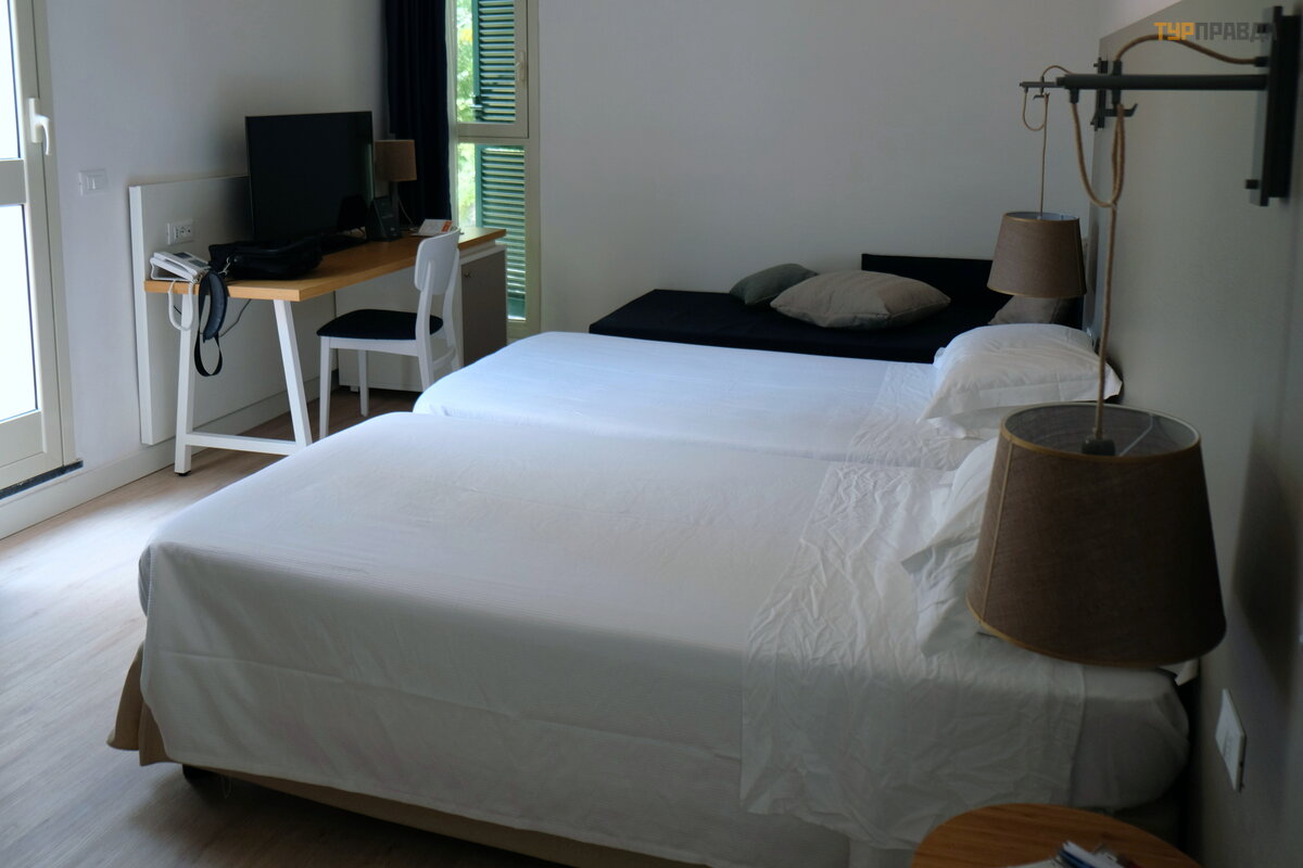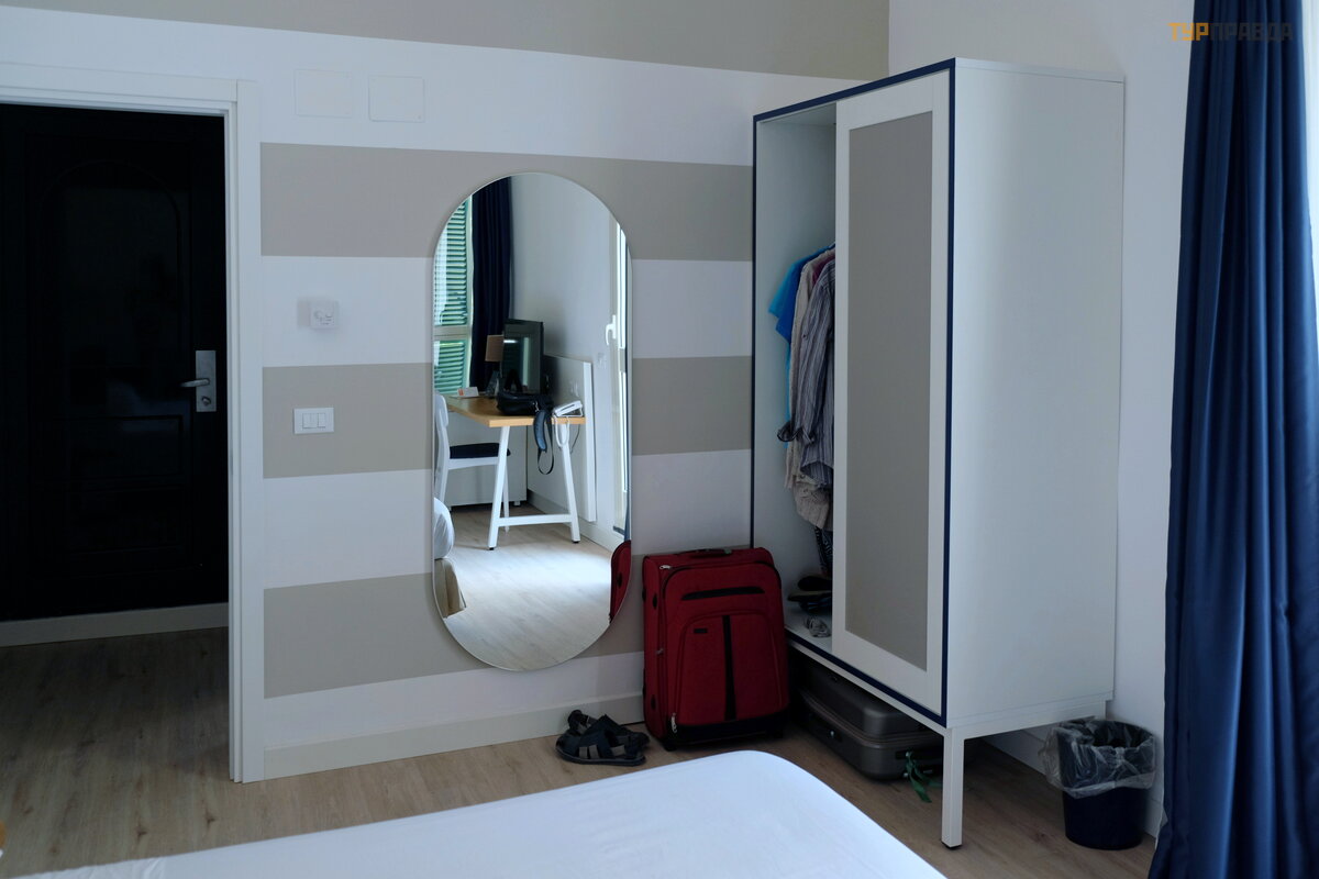 Kambario dekoras standartinis, labai patogu, kad kartu su kondicionieriumi yra ir ventiliatorius. Netoli vieš buč io į jū rą į teka upė , dė l š io lango nerekomenduojama nakč iai atidaryti dė l uodų . Iš mū sų kambaryje esanč ios lodž ijos aiš kiai matosi Etna.