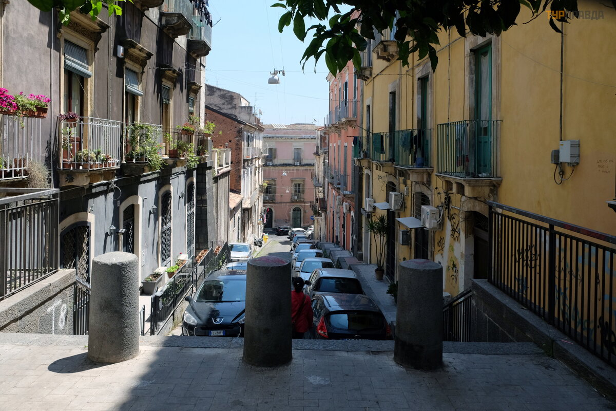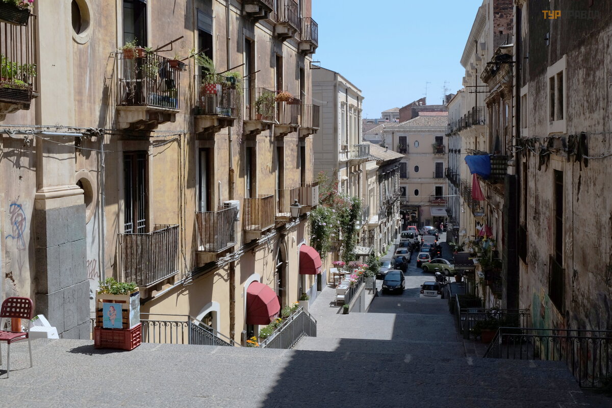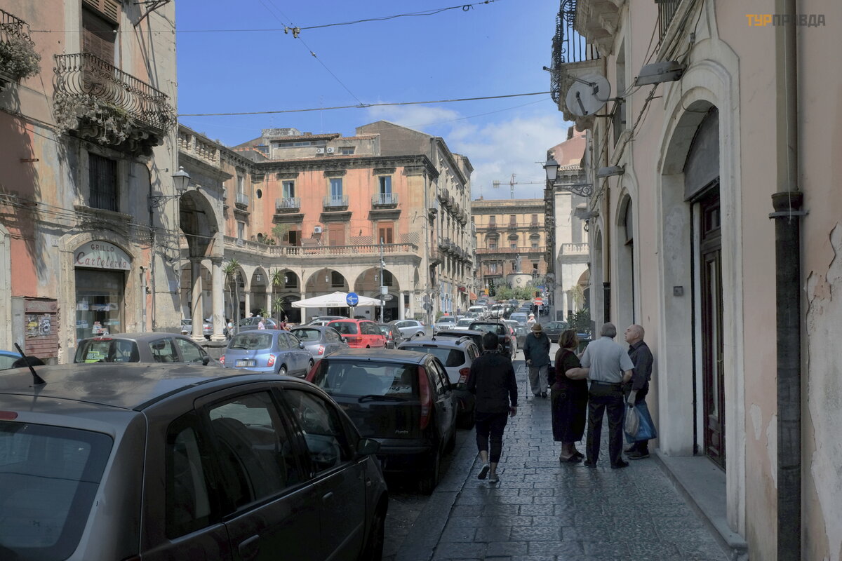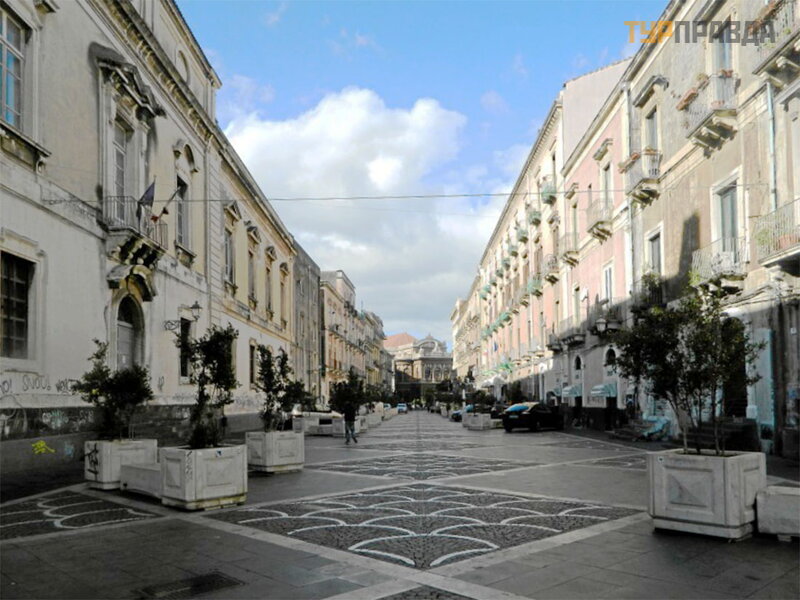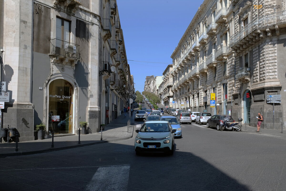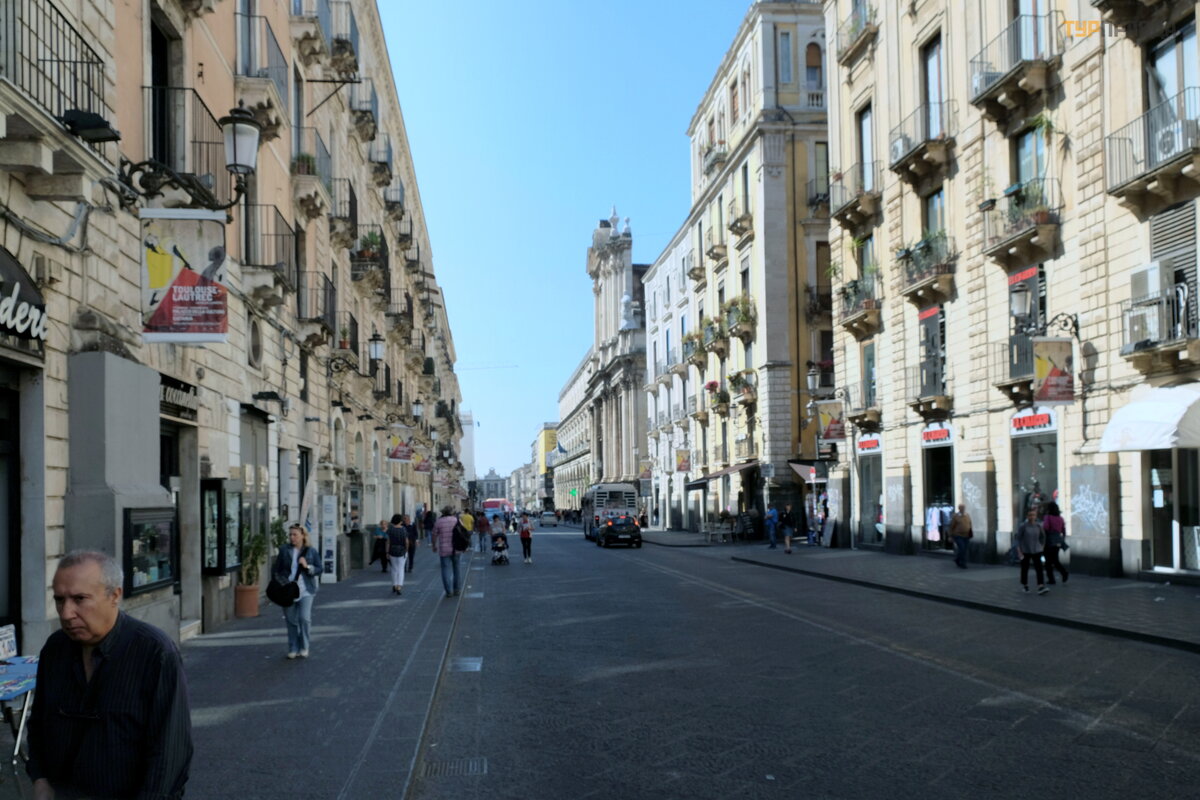 Iš autobusų stoties einame pagrindine Katanijos gatve – Via Etna, kuri tę siasi 3 km iš pietų į š iaurę , pilna istorinių į ž ymybių , daugybė s parduotuvių ir kavinių . Č ia taip pat į sikū rę s vienas didž iausių prekybos centrų „La Rinascente“.