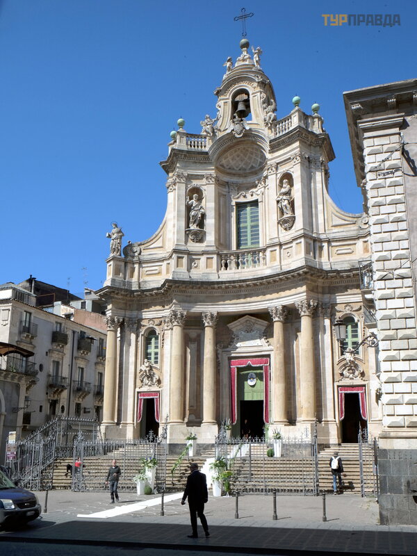 Kitas Vaccarini š edevras – Badia di Sant'Agata baž nyč ia (1767 m. ) – puikiai matoma iš Piazza Duomo, esanč ios katedros kairė je.